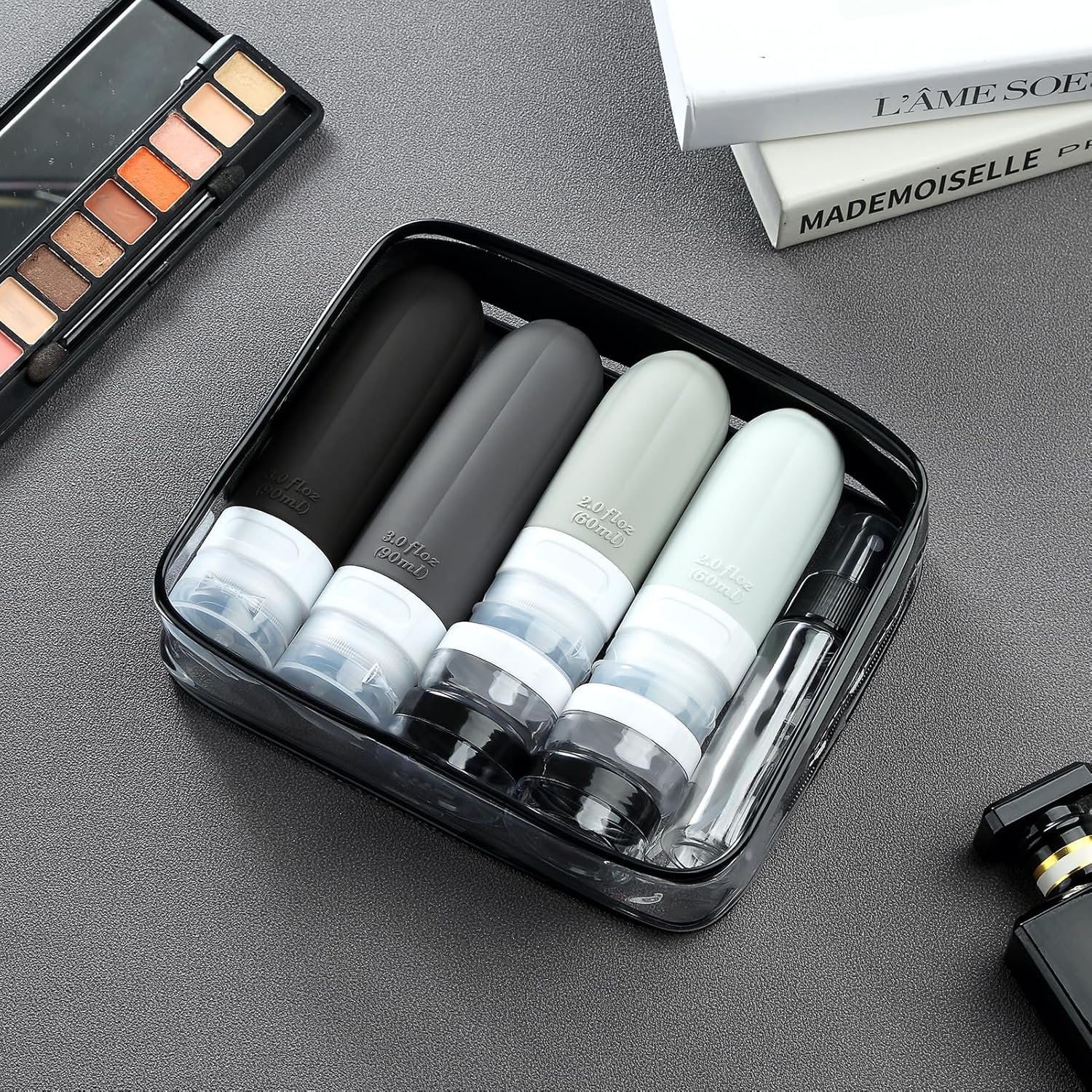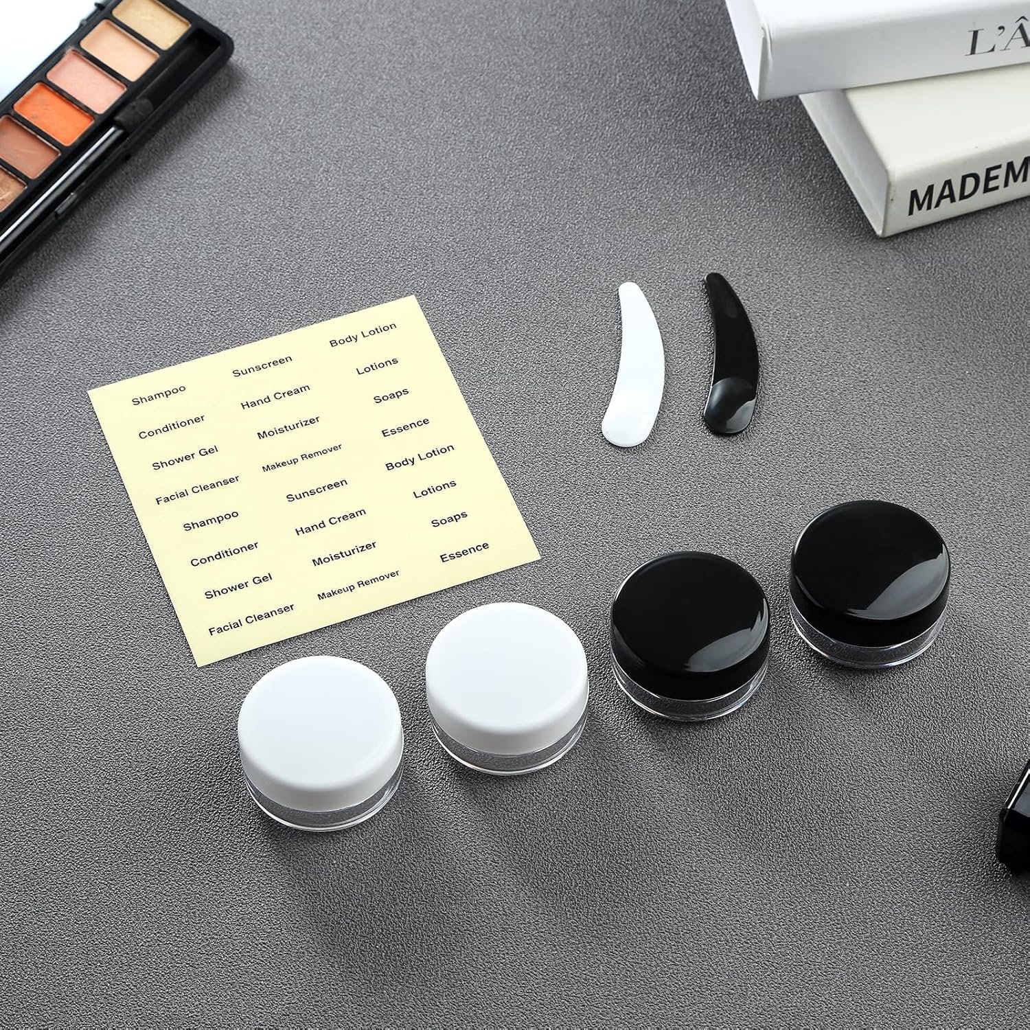 Useful Travel Accessories: This is a nice assortment of travel containers in a useful zip case. ( Come in 4 Travel Bottles+4 Travel Jars+2 Spray Bottles+2 Scoopers+1 Funnel+1 Clean Brush + 1 Page Label + 1 Clear Toiletry Bag ) Multiple ones allow you take along different beauty products and toiletries according to your requirement