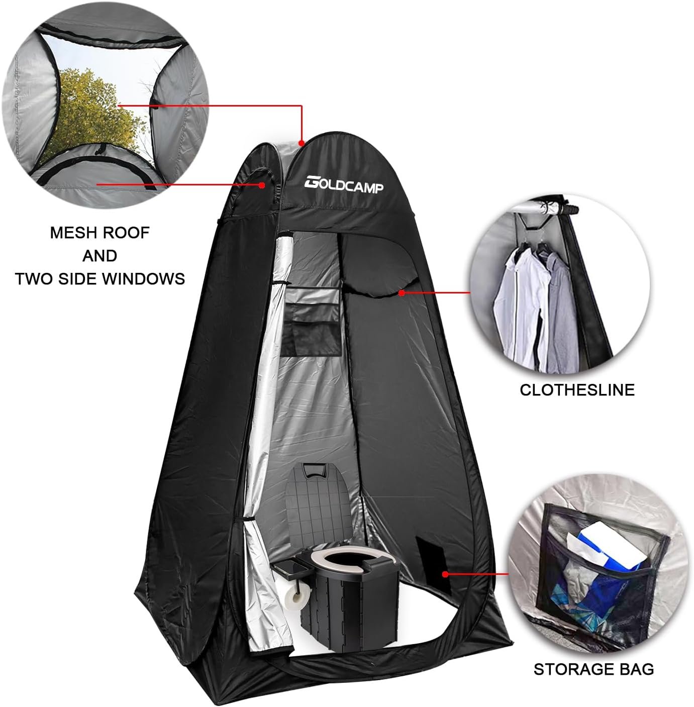 The GOLDCAMP Camping Shower Tent Privacy Tent is a versatile and convenient solution for outdoor activities. This pop-up tent provides a private and spacious shelter for changing clothes, showering, or using as a portable toilet. With its UV protection, ventilation, and durable construction, it offers a comfortable and secure space for your outdoor needs.