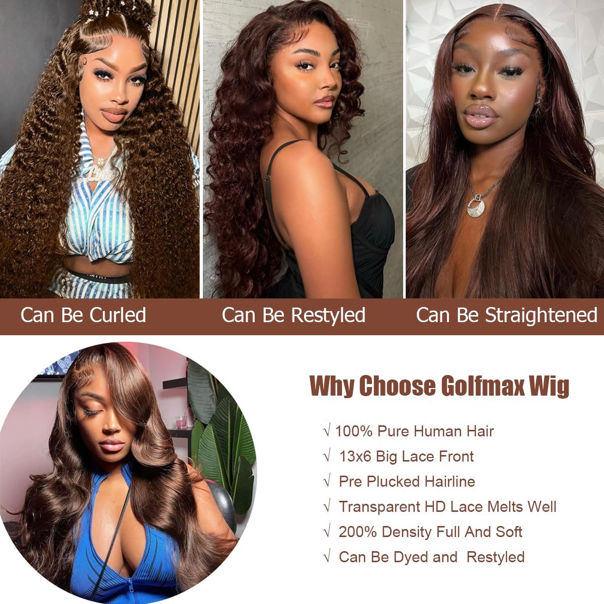 GOLFMAX Chocolate Brown Lace Front Wig Human Hair Body Wave 13×6 HD Lace Front Wigs Human Hair Pre Plucked 200 Density Colored 4# Brown Wig Human Hair Wigs For Women 28 Inch
