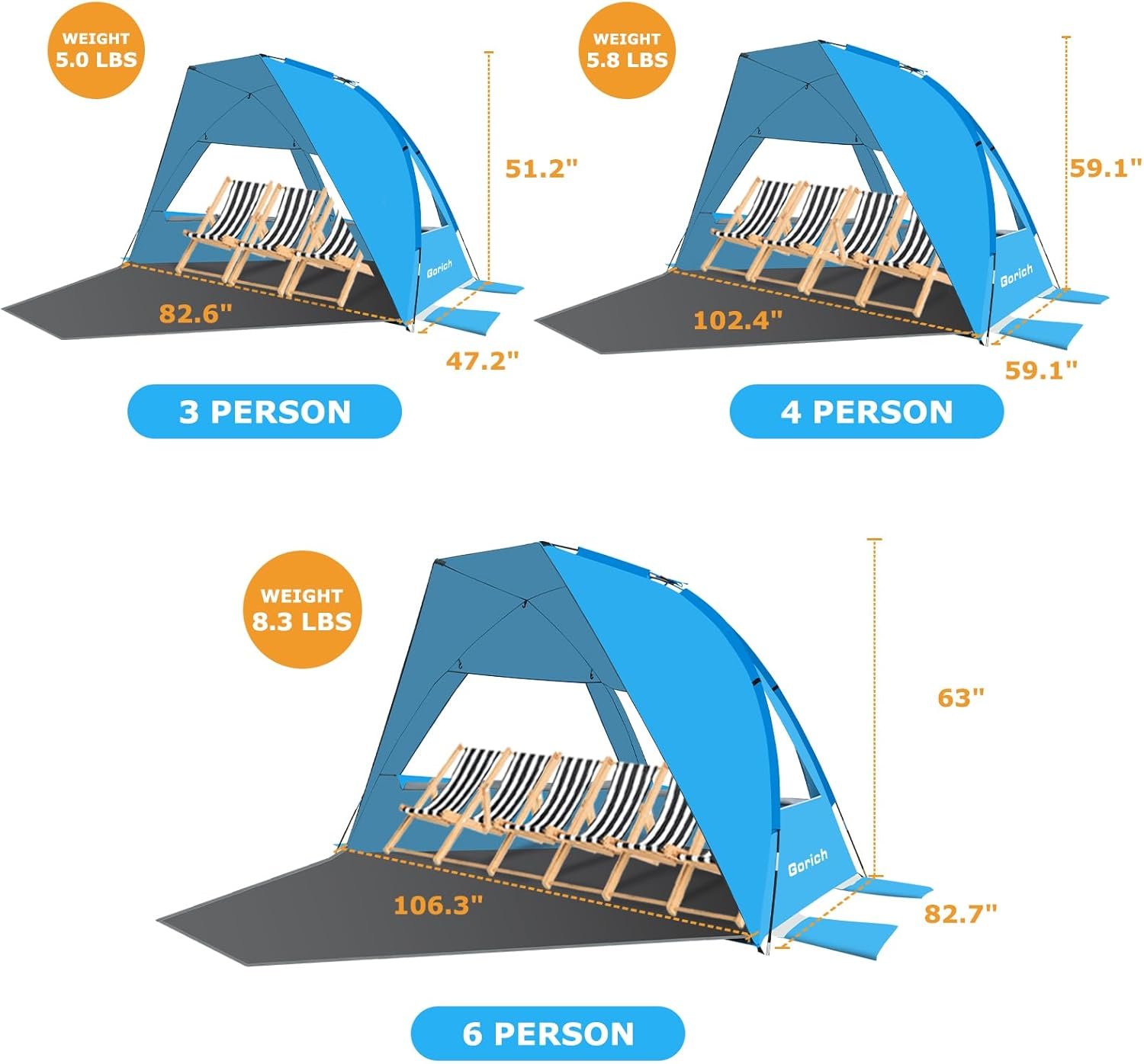 Gorich Portable Beach Tent for 3-6 Person with UPF 50+ UV Protection, Lightweight & Foldable Sun Shelter with 5 Sand Bags, Easy Setup Windproof Beach Umbrella Sun Shade