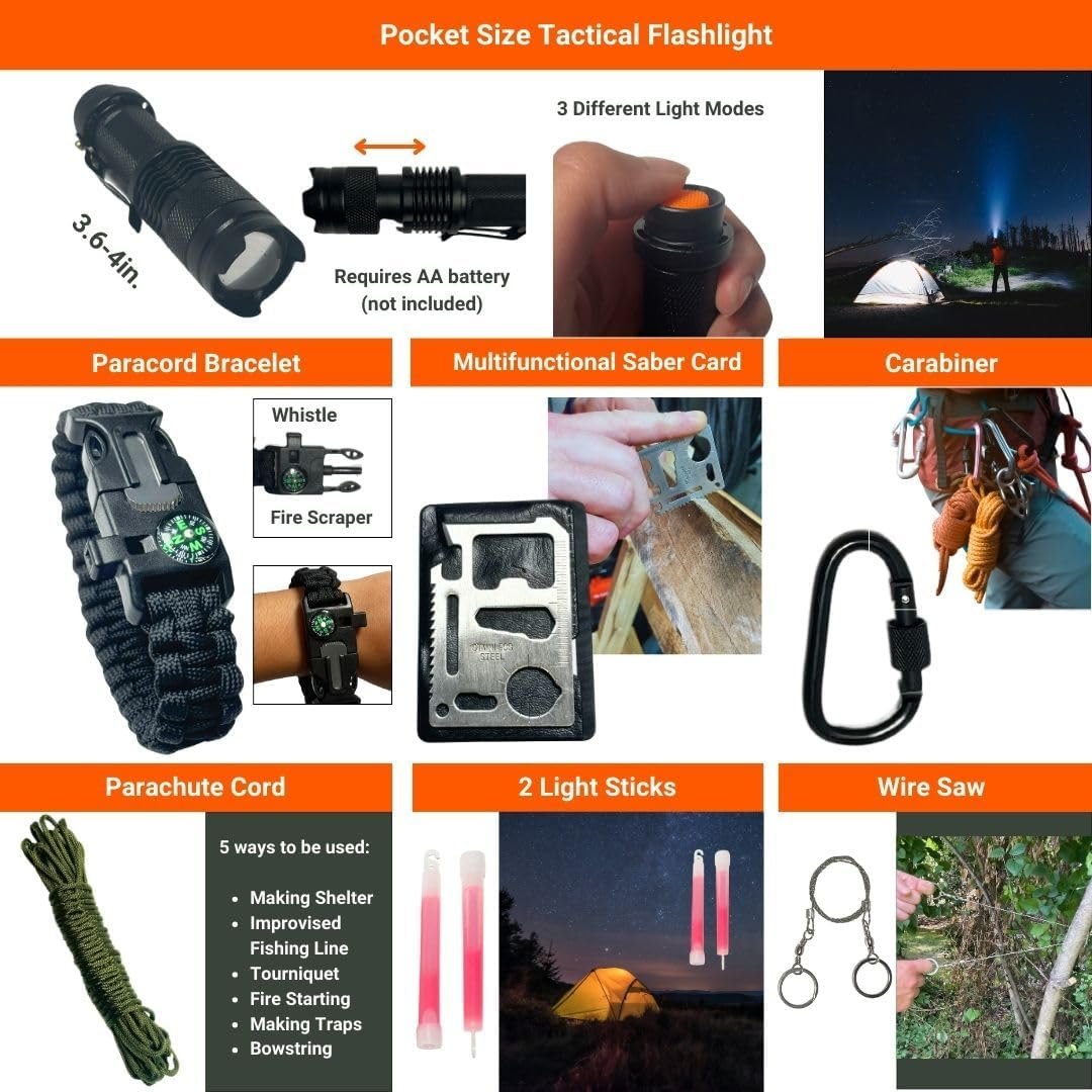 ✅ Versatile Application: Suitable for a wide range of users including hikers, civilians, homeowners, firefighters, first aid personnel, and outdoor enthusiasts, this survival kit is perfect for use in cars, boats, bicycles, motorcycles, workplaces, and various outdoor activities.