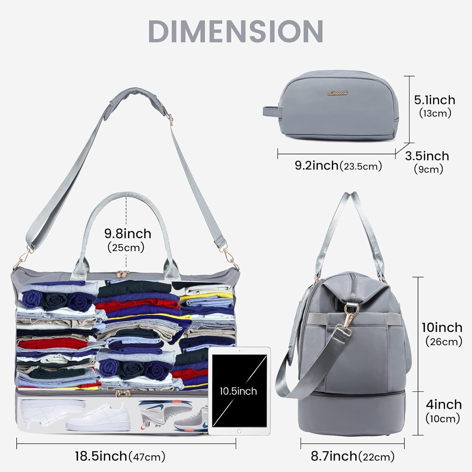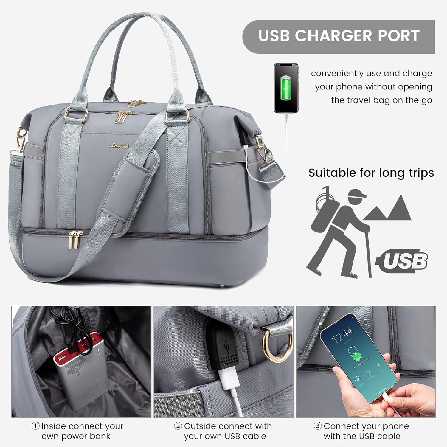 【LARGE CAPACITY TRAVEL BAG WITH USB CHARGING PORT+SHOE COMPARTMENT+FREE SEPERATE TOILETRY BAG】this travel bags for women combine with USB charging port,offers an easy access to charge your phone on the go. personal item travel bag with the shoe compartment,you can hold your shoes or dirty clothes for easy separation from clean clothes when traveling,The main compartment can fit 3-4days travel essential items.A large zipper pocket on the front, for storing your daily necessities.