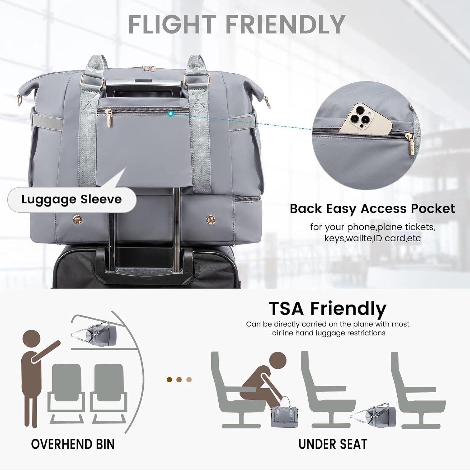【FLIGHT APPROVED CARRY ON BAGS FOR AIRPLANES】Sizes- 18.5x 8.7x 14inch,LOVEVOOK duffle bag for women meets most international carry-on requirements. Fits in the overhead compartment as well as the under seat as Personal Items in flight. Integrated trolley sleeve slides over rolling luggage handle making airport travel a breeze.One zippered pocket on the back to hold your smart phone, IDs or passport.Your ideal overnight weekend boarding bag for business or personal travel.