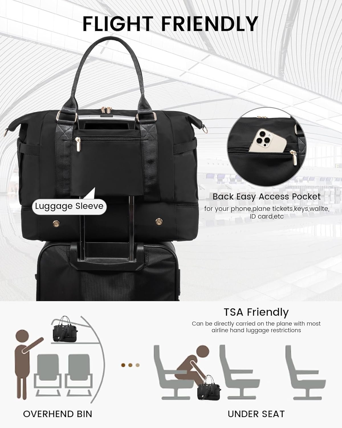【FLIGHT APPROVED CARRY ON BAGS FOR AIRPLANES】Sizes- 18.5x 8.7x 14inch,LOVEVOOK duffle bag for women meets most international carry-on requirements. Fits in the overhead compartment as well as the under seat as Personal Items in flight. Integrated trolley sleeve slides over rolling luggage handle making airport travel a breeze.One zippered pocket on the back to hold your smart phone, IDs or passport.Your ideal overnight weekend boarding bag for business or personal travel.