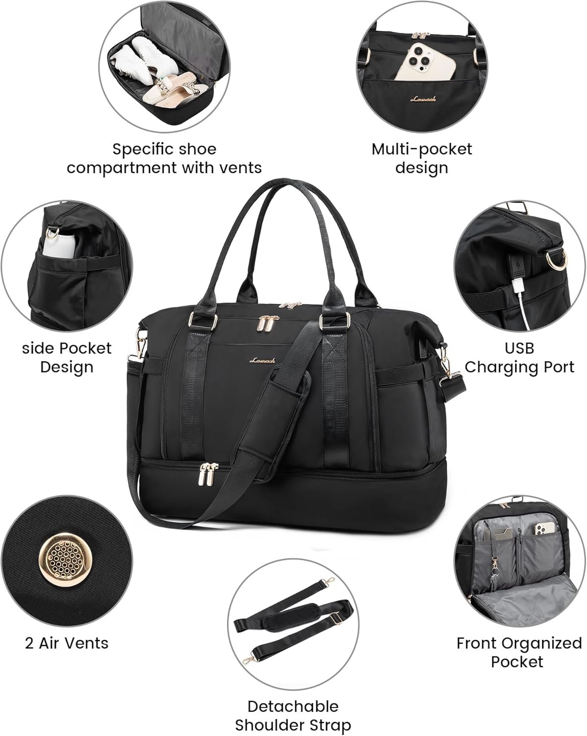 【LARGE CAPACITY TRAVEL BAG WITH USB CHARGING PORT+SHOE COMPARTMENT+FREE SEPERATE TOILETRY BAG】this travel bags for women combine with USB charging port,offers an easy access to charge your phone on the go. personal item travel bag with the shoe compartment,you can hold your shoes or dirty clothes for easy separation from clean clothes when traveling,The main compartment can fit 3-4days travel essential items.A large zipper pocket on the front, for storing your daily necessities.