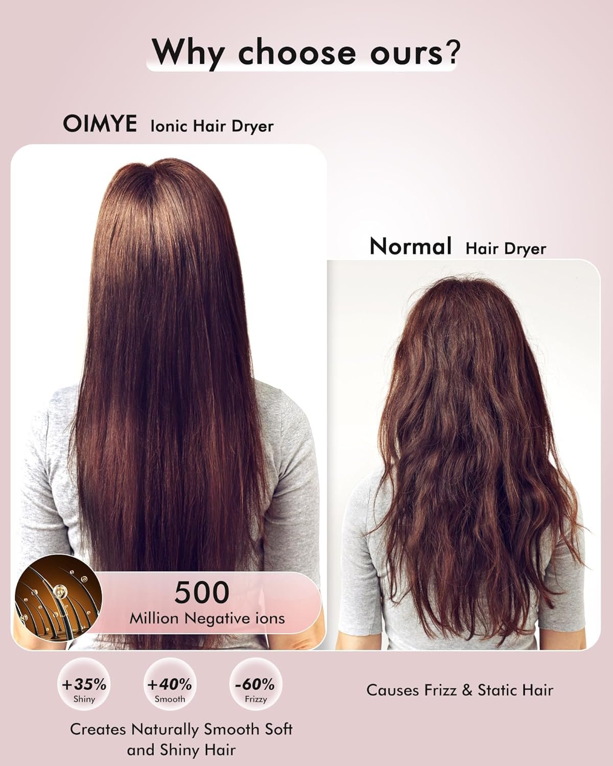 🌟【Negative Ionic Technology for Softer & Smoother Hair】 — Experience the magic of ionic hair care. High-velocity airflow incorporates up to 500 million negative ions to help seal and flatten the hair cuticle, locking up to 90% moisture of your hair, deeply nourishing your hair, protect your scalp, makes hair hydrated and glossier. Our ionic hair dryer also eliminates static electricity on the hair surface so hair is less likely to tangle, frizz-free, silk smooth, and looks healthier