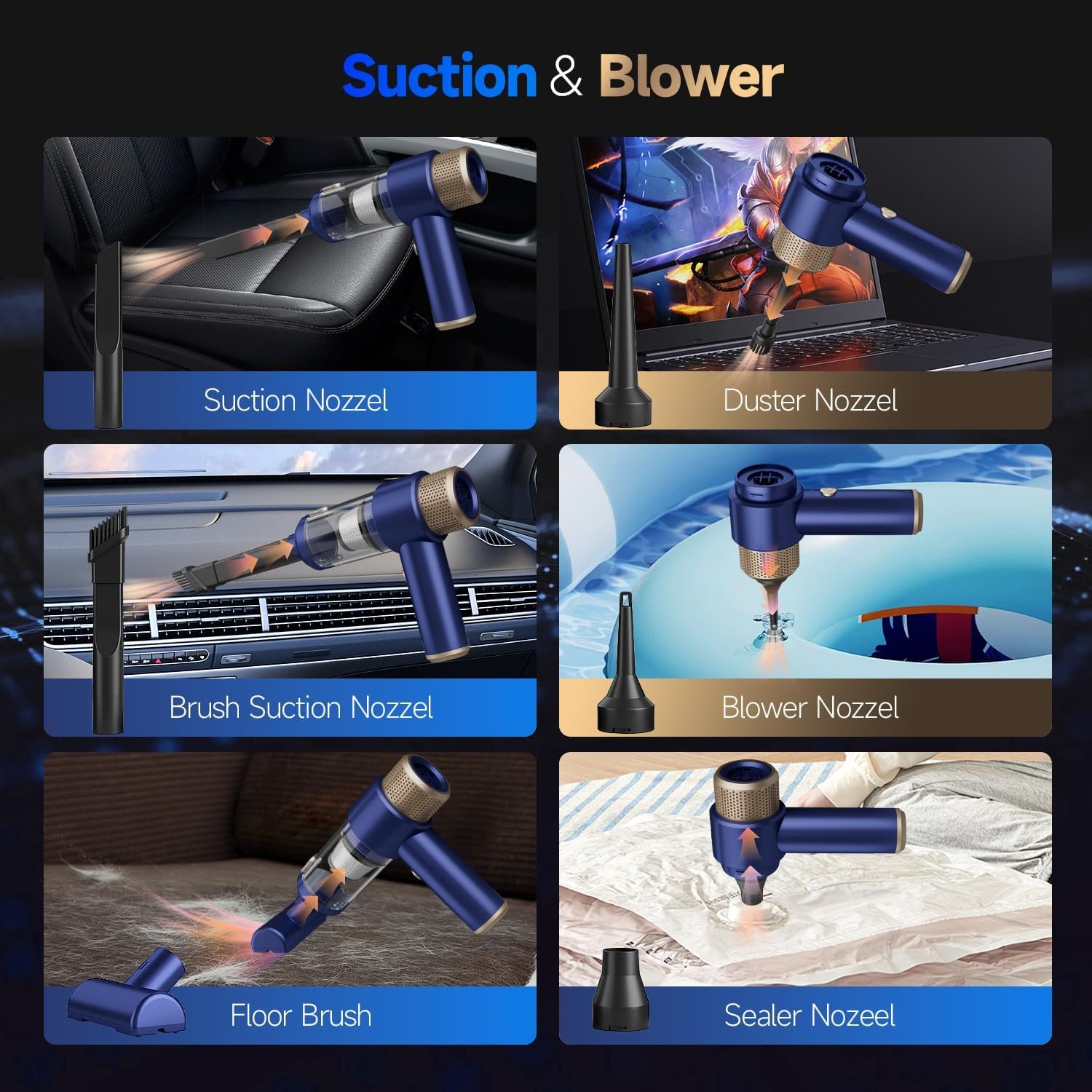 🚀【7-in-1 Multifunctional Cordless Car Vacuum Cleaner】: The handheld vacuum cordless with 7 accessories supports multiple modes, such as vacuuming, blower, inflation, pump. Hand vacuum can meet different need for daily cleaning tasks and even clean hard-to-reach corners, such as blowing or vacuuming dust or debris from seats, keyboards, camera lens, desk, computer host and cabinet corners, or inflating or expeling air from swimming rings and mattresses, or Blow air for BBQ fire, etc