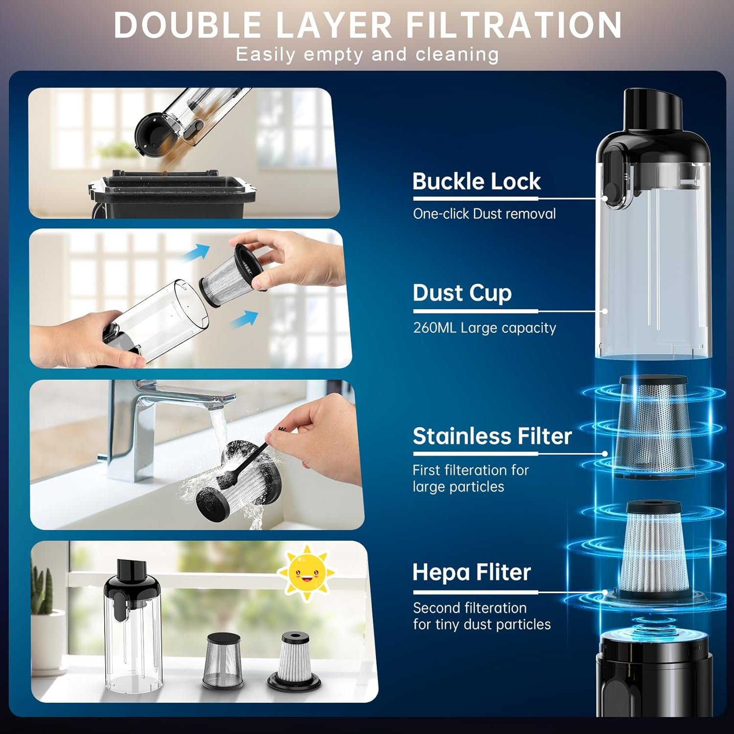 HIGH POWER SUCTION: Upgraded Brushless Motor supports a maximum speed of 80,000 rpm and provides 16kpa high power suction. 2 modes available easily suck away stubborn sand, dust, and debris in seconds during daily messes. (Hold down the power button for 3S to power on, and hold down the power button again for 3S to power off.)