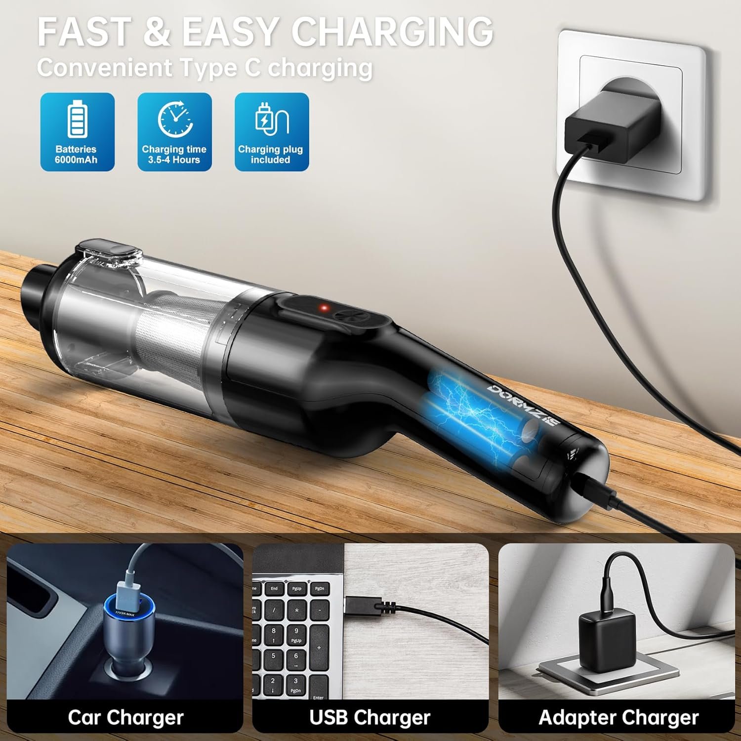 LONG RUNNING TIME: The car vacuum cleaner is equipped with a 6000mAh battery, which can work up to 25-30 minutes for a deep cleaning. Fast TYPE-C charging can be fully charged within 3.5 hours. You can charge it anywhere in car or home. (Comes with charging cable and adapter)*Note: For safety, this product can’t turned on while charging*