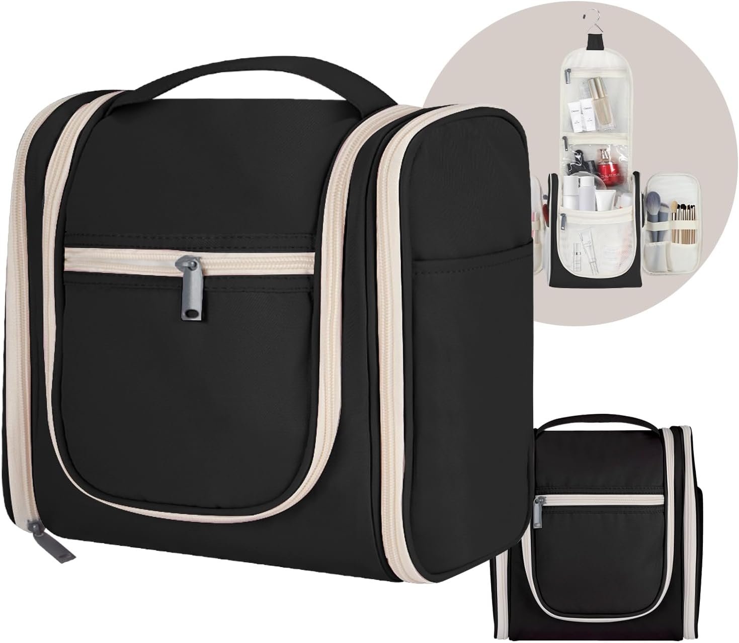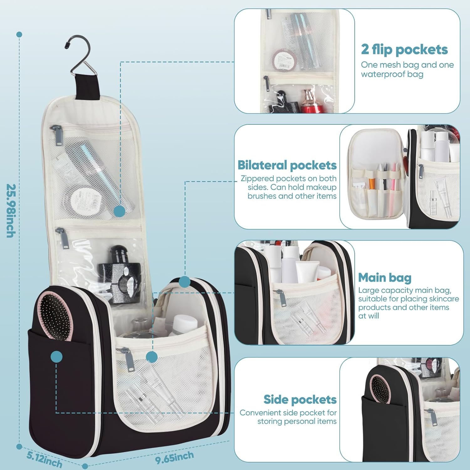 Large Capacity & Organized Storage: This hanging toiletry bag features a spacious main compartment and multiple pockets, allowing you to neatly store all your travel essentials, from shampoo bottles to makeup brushes, keeping everything organized and easily accessible