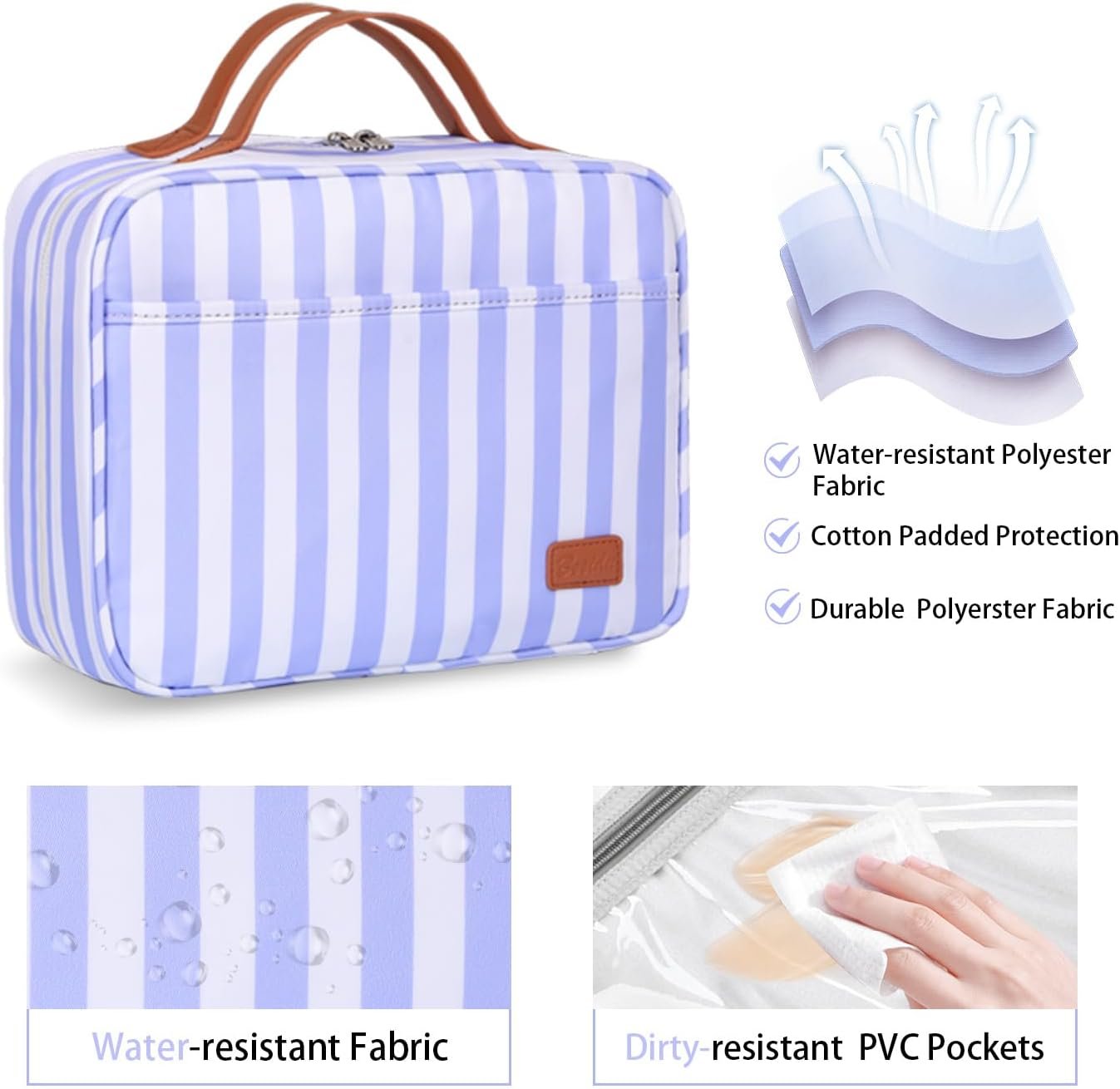 Easy to Clean PVC Pockets – This travel Toiletry Bag comes with PVC dustproof zippered pockets to store your brushes, sponges and puffs. It makes it easy for you to clean it and you no longer have to worry about the bag or items getting dirty.
