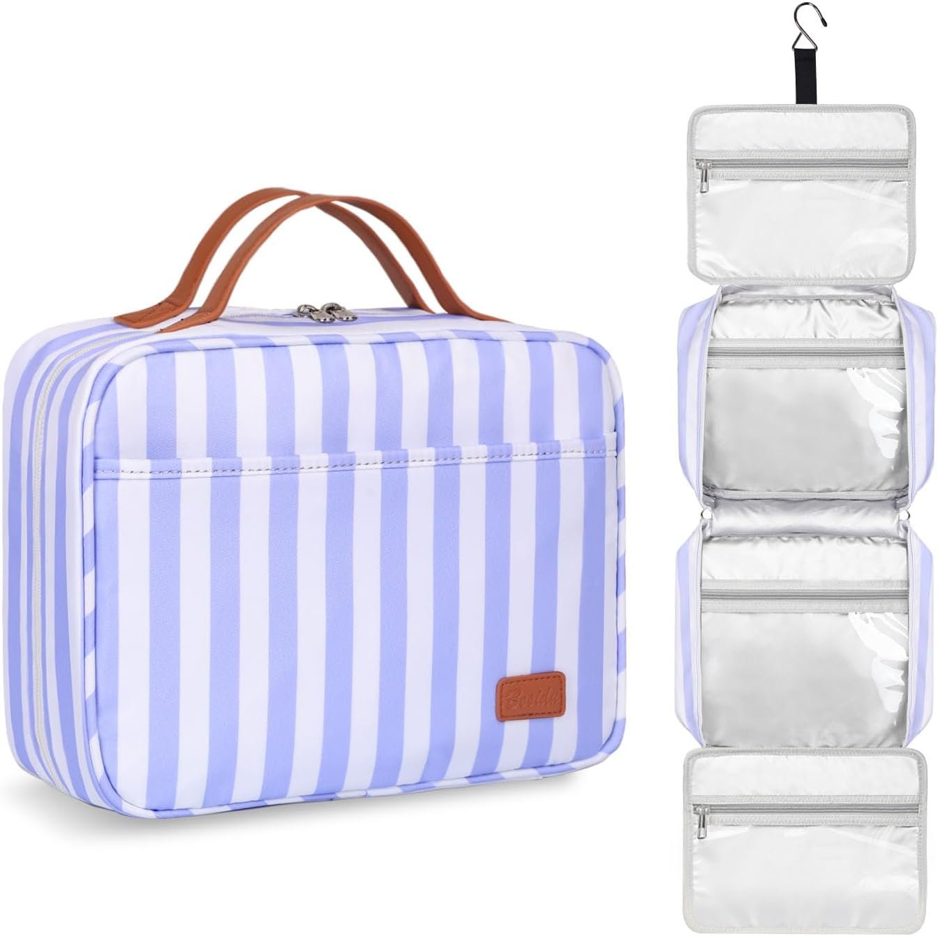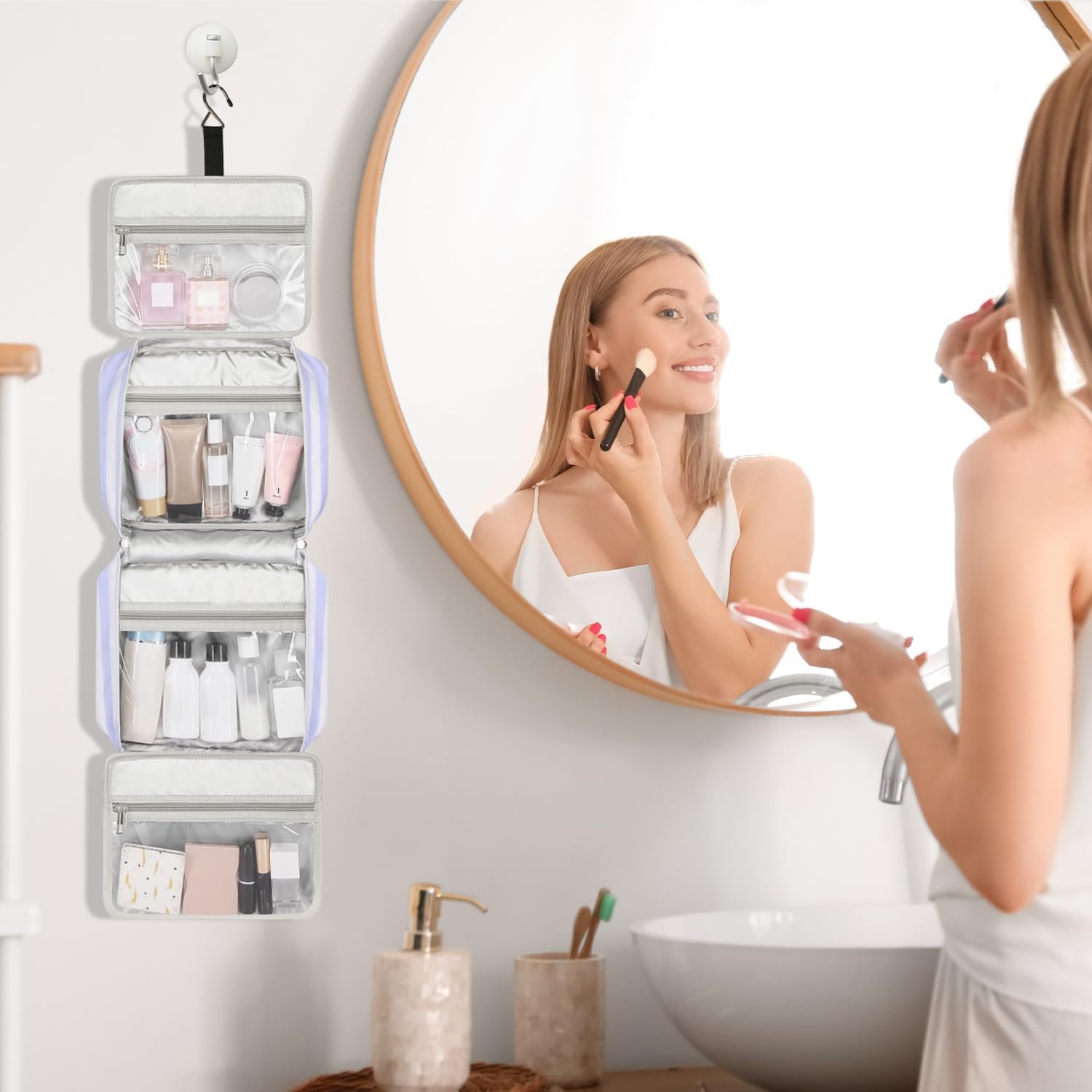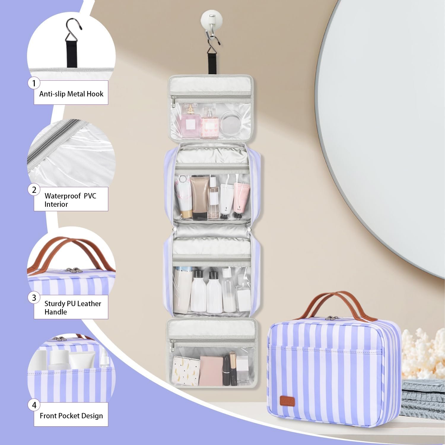 Sturdy Non-slip Hook Design – This non-slip metal hook allows hanging the travel cosmetic bag from a towel rack, coat hook, or wherever is available, making your toiletries and cosmetics displayed well for easy access and saving bathroom counter space as well.