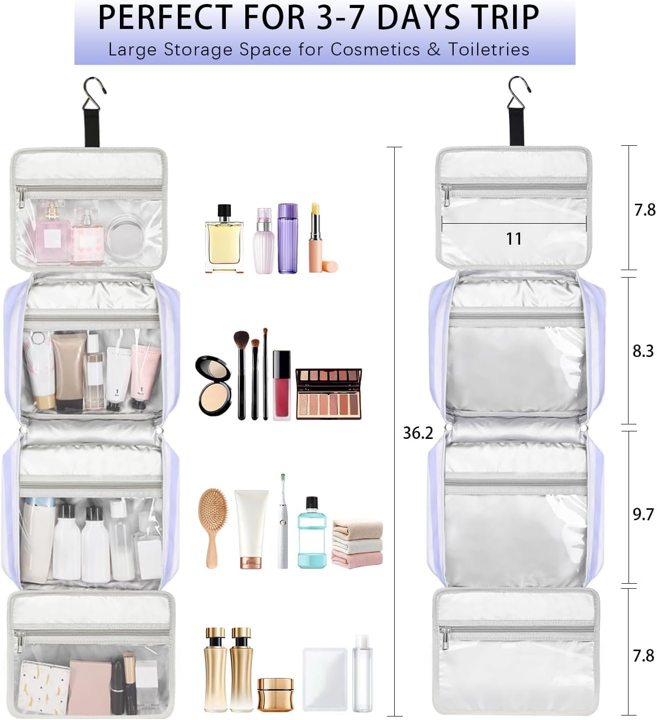 Dimension – 11 x 4 x 9 inches (rolled), 11 x 39 inches (open). The space-efficient hanging toiletry bag can hold all your travel essentials: travel-sized shampoo, Conditioner, and skin care products.
