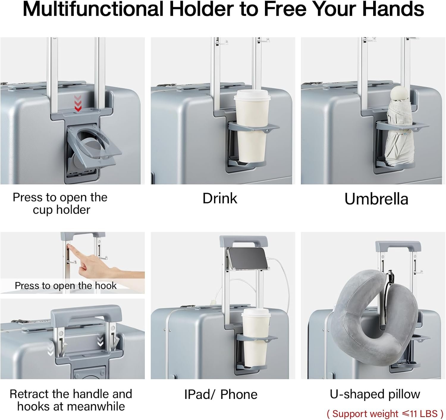 【Multifuctional Holder】This luggage feature with cup holper that is convenient to place drinks, water bottle, umbrella, etc,. And amazingly there is a phone holder on the handle and it also be as a hook while traveling to hang your bag, U-shaped pillow.