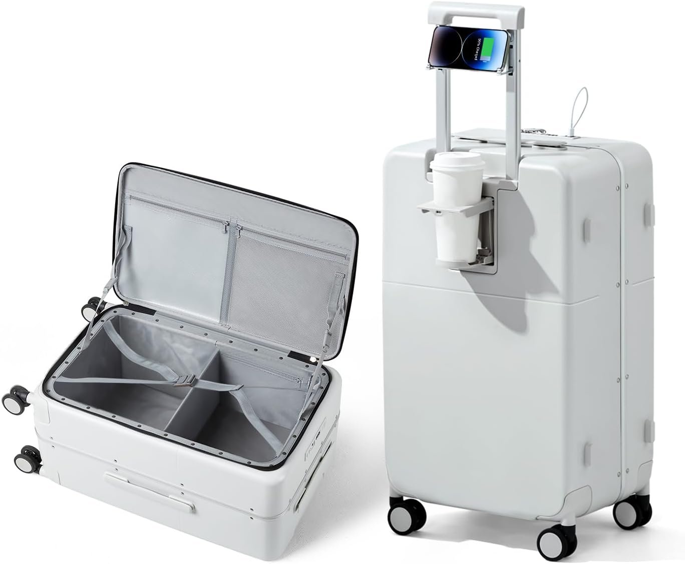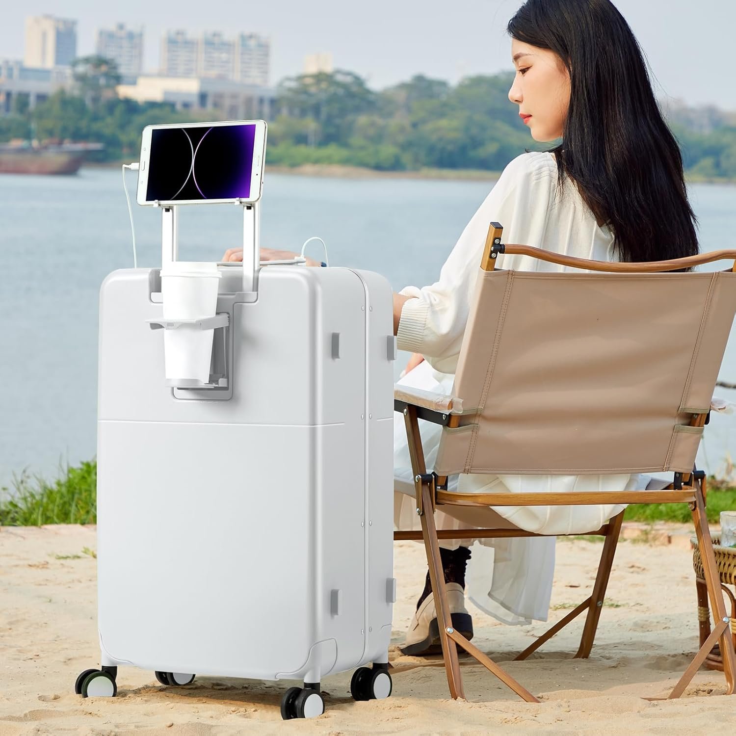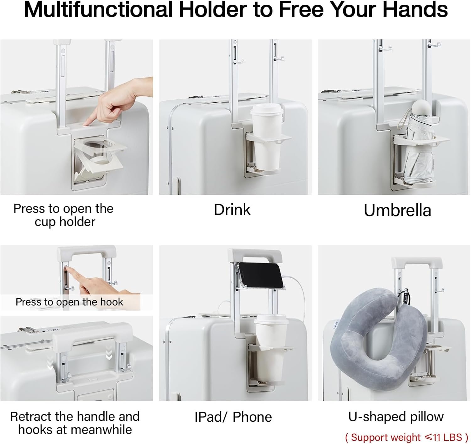 【Multifuctional Holder】This luggage feature with cup holper that is convenient to place drinks, water bottle, umbrella, etc,. And amazingly there is a phone holder on the handle and it also be as a hook while traveling to hang your bag, U-shaped pillow.
