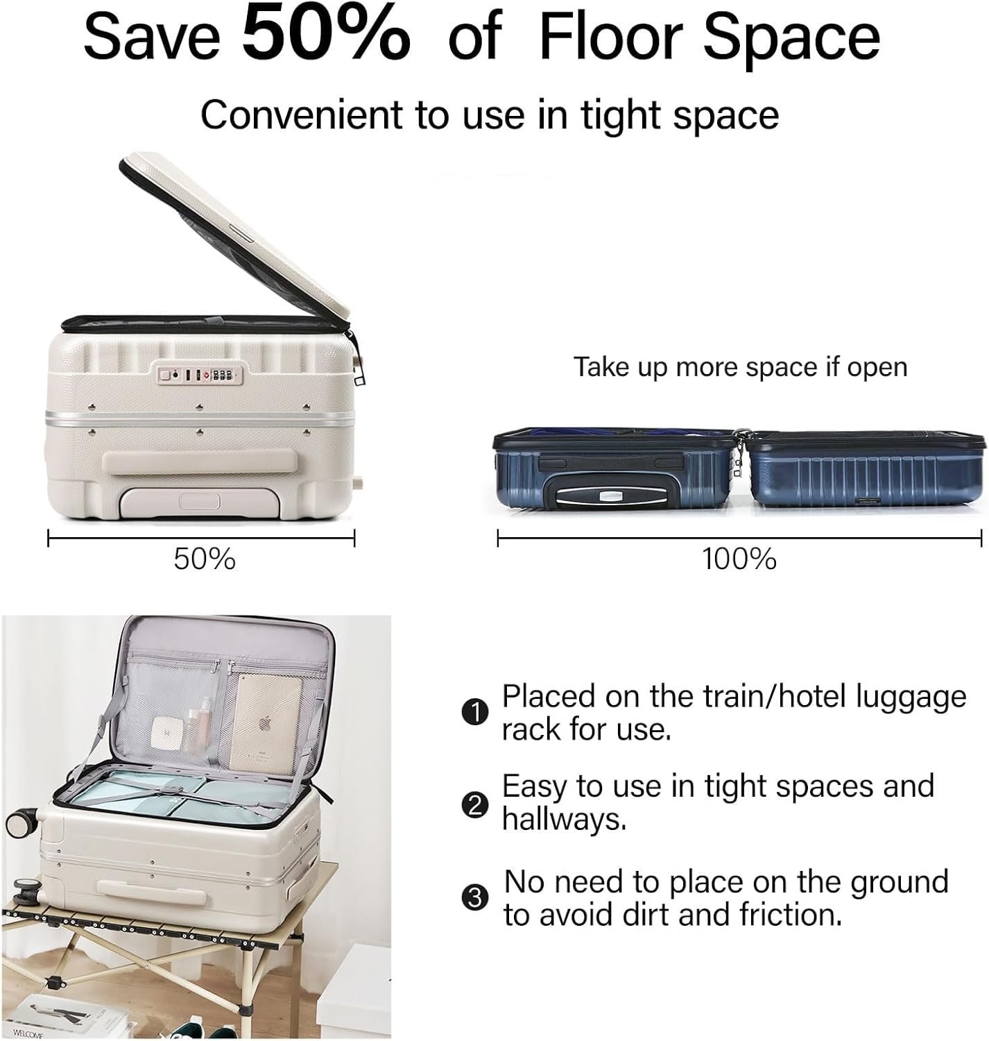 【CREATIVE FRONT OPENING】 Leading the future opening and closing method which is effortless to open or close the suitcase, not only is it easy to load, but it also saves space. This design solves the problem that traditional luggage separated 2 compartments of heavy load then it’s difficult to open and close. Importantly, it also avoid the displacement of items.