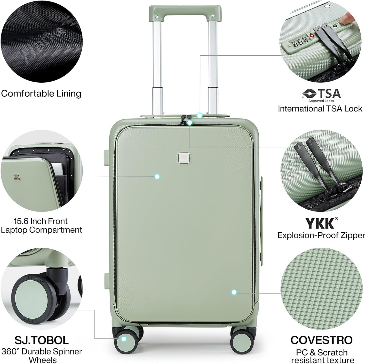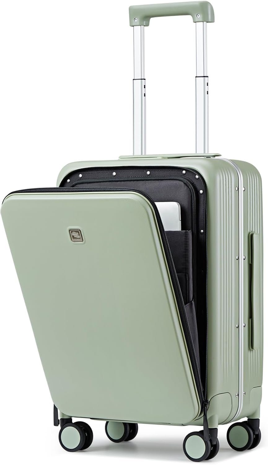 Hanke Grace Hard Shell Suitcases with Wheels,20 Inch Carry On Luggage Airline Approved with Aluminum Frame, Travel suitcase with Front Pocket Travel Luggage for Short Business Trips, Bamboo Green.