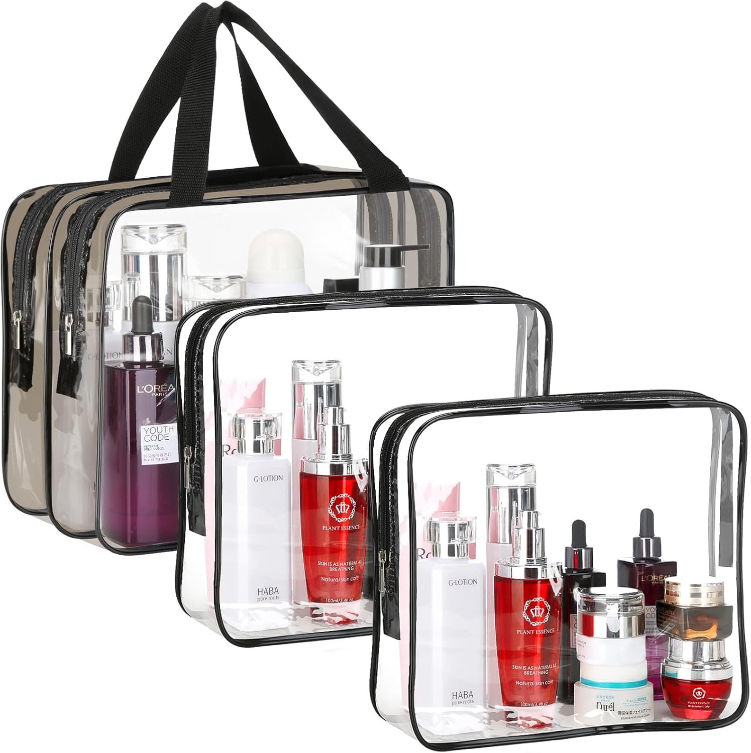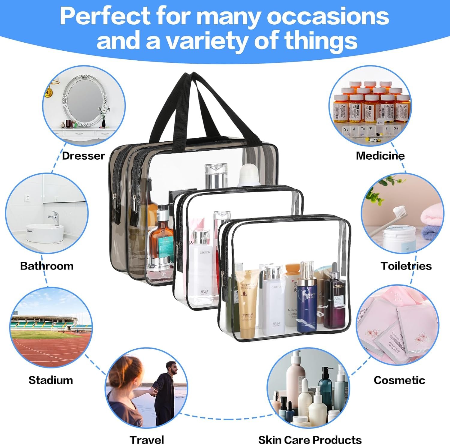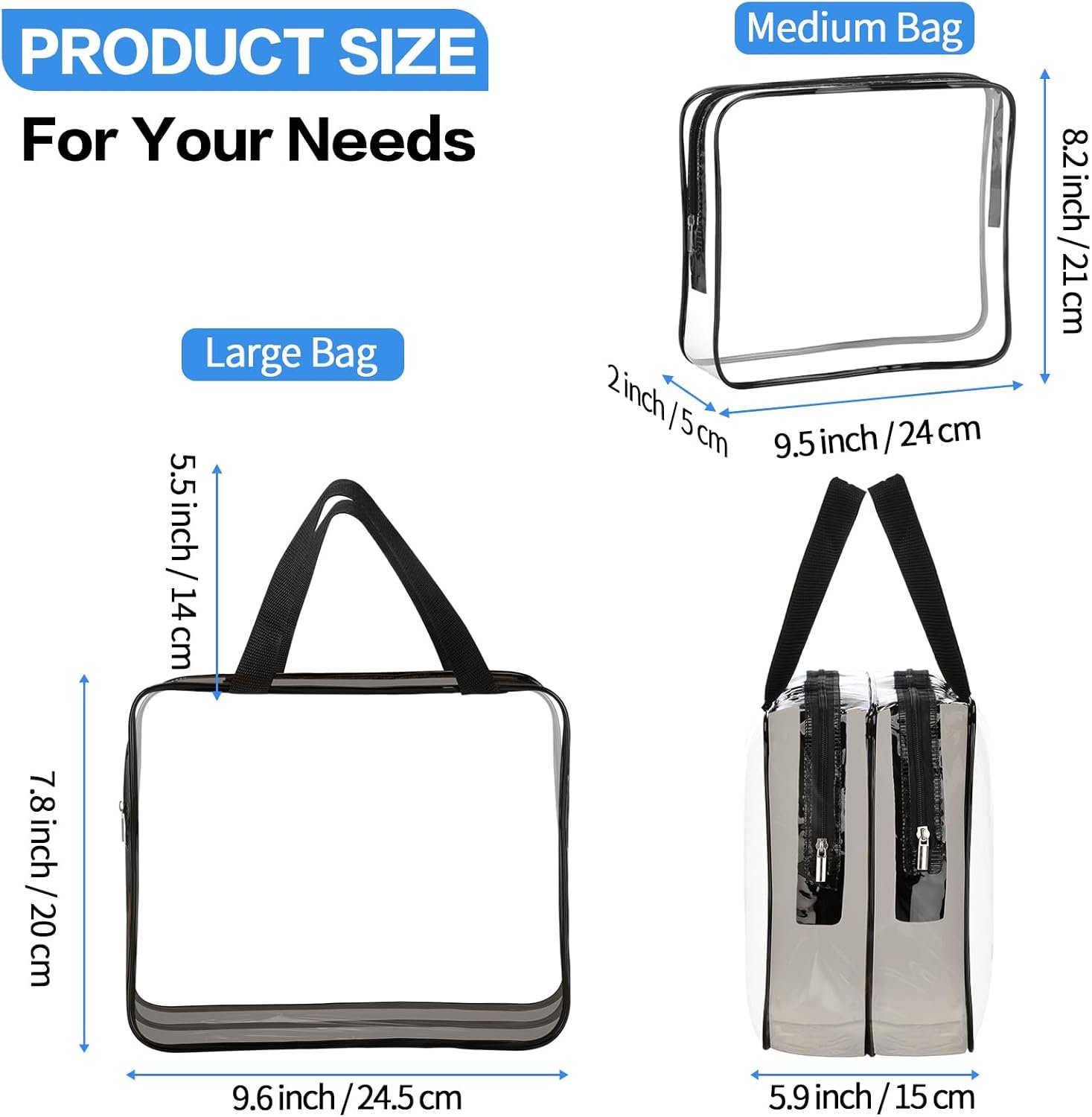 3 PACKS 2 DIFFERENT SIZE – 1 x Large clear makeup bag: 9.6*7.8*5.9inch/24.5*20*15cm.2 x Medium clear toiletry bag:9.5*8.2*2inch/24*21*5cm. Large Capacity zipped bag, designed to hold all your personal essentials in one place: full-size shampoo bottles, beauty products, medicines, shaving cream, hair dryers, makeup, dental care and more.