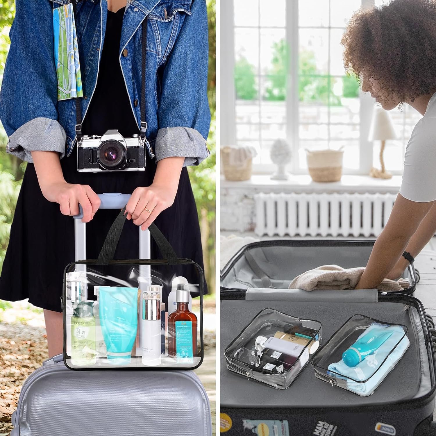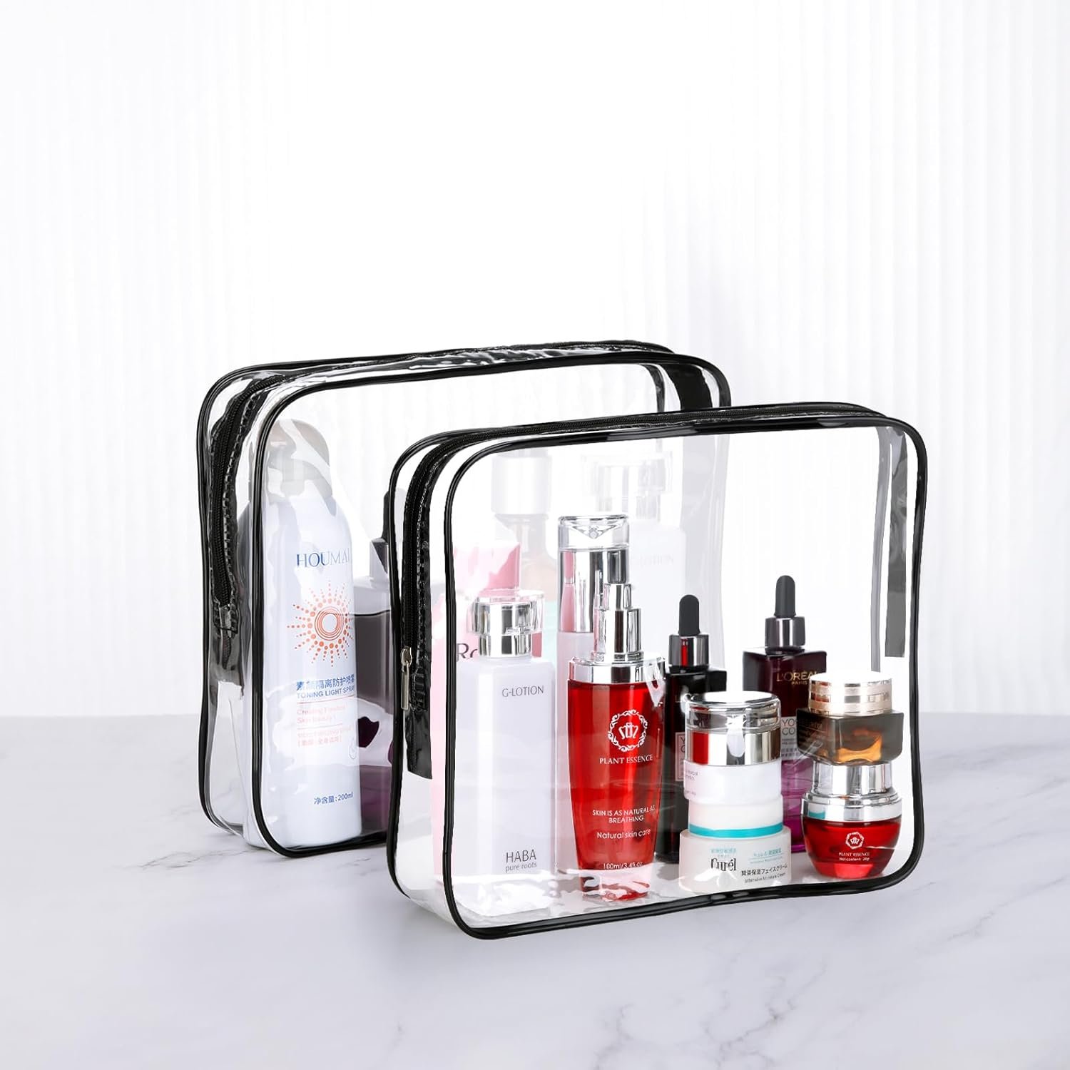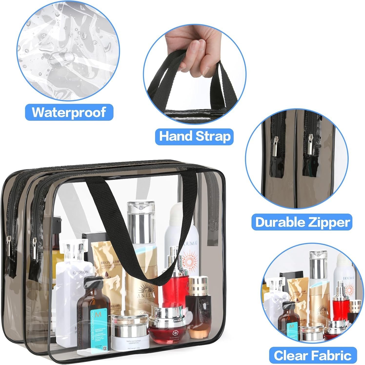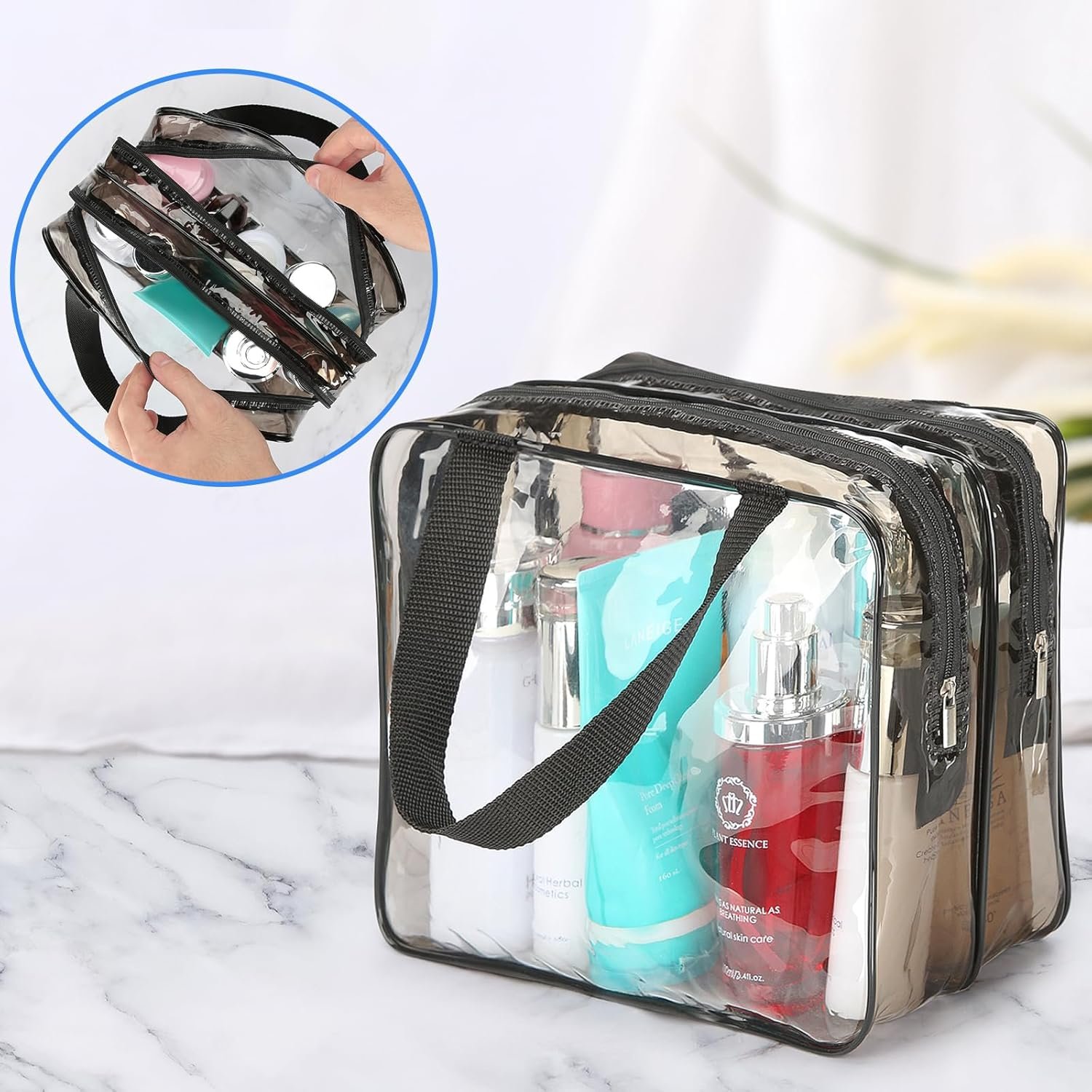 3 PACKS 2 DIFFERENT SIZE – 1 x Large clear makeup bag: 9.6*7.8*5.9inch/24.5*20*15cm.2 x Medium clear toiletry bag:9.5*8.2*2inch/24*21*5cm. Large Capacity zipped bag, designed to hold all your personal essentials in one place: full-size shampoo bottles, beauty products, medicines, shaving cream, hair dryers, makeup, dental care and more.
