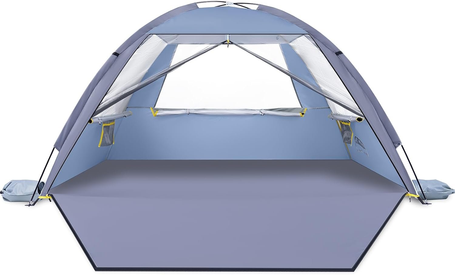【Excellent Ventilation & Views】The beach tent sun shelter adopts a four-side ventilation design, equipped with a zippered door and three adjustable large ventilation windows with screens. Moreover we increased the height of the door and added a screens on the doors. It has a sand-proof effect, not only providing great ventilation, Keep cool all the time, but also gives you a better views appreciation of the beautiful beach scenery.