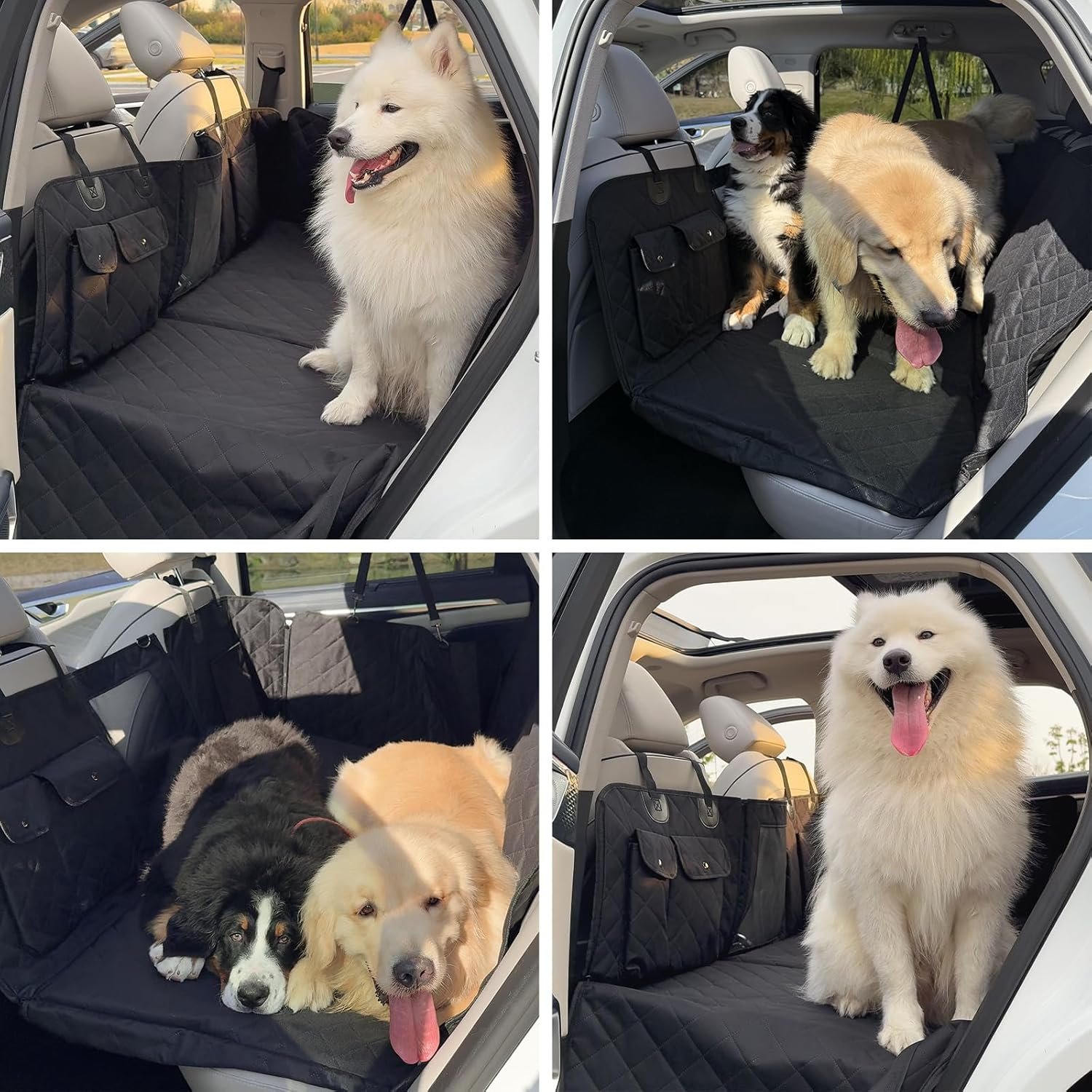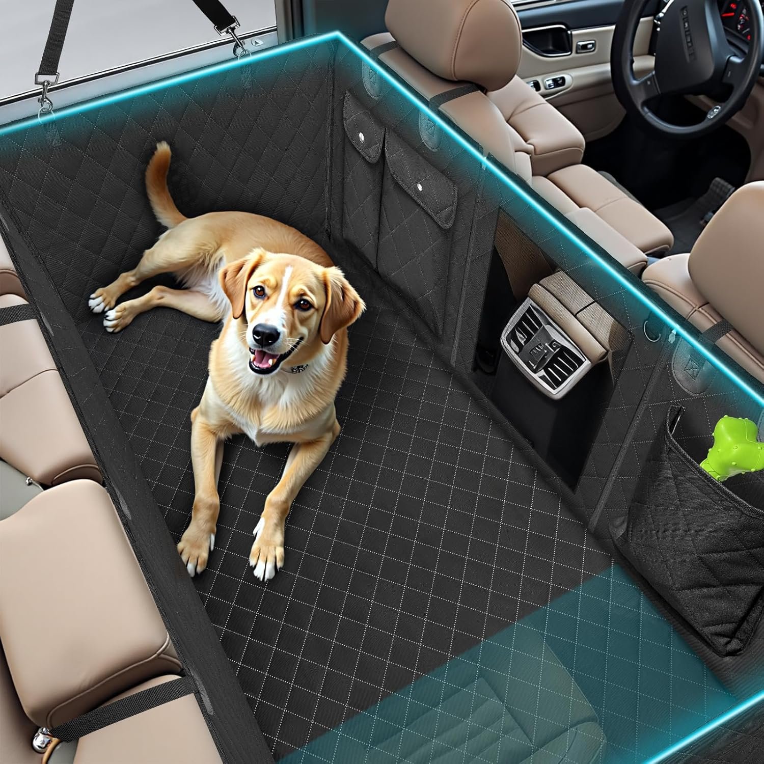 【Hard Bottom & Extended Capacity】Engineered with 3 Hardwood panels to hold up to 400lbs, and +40% Extra Space for Large Dogs—ideal for large breeds or multi-dog families. The rigid flat surface prevents pets from sliding into footwells during sudden stops, offering 70% more stability than flimsy soft hammocks.