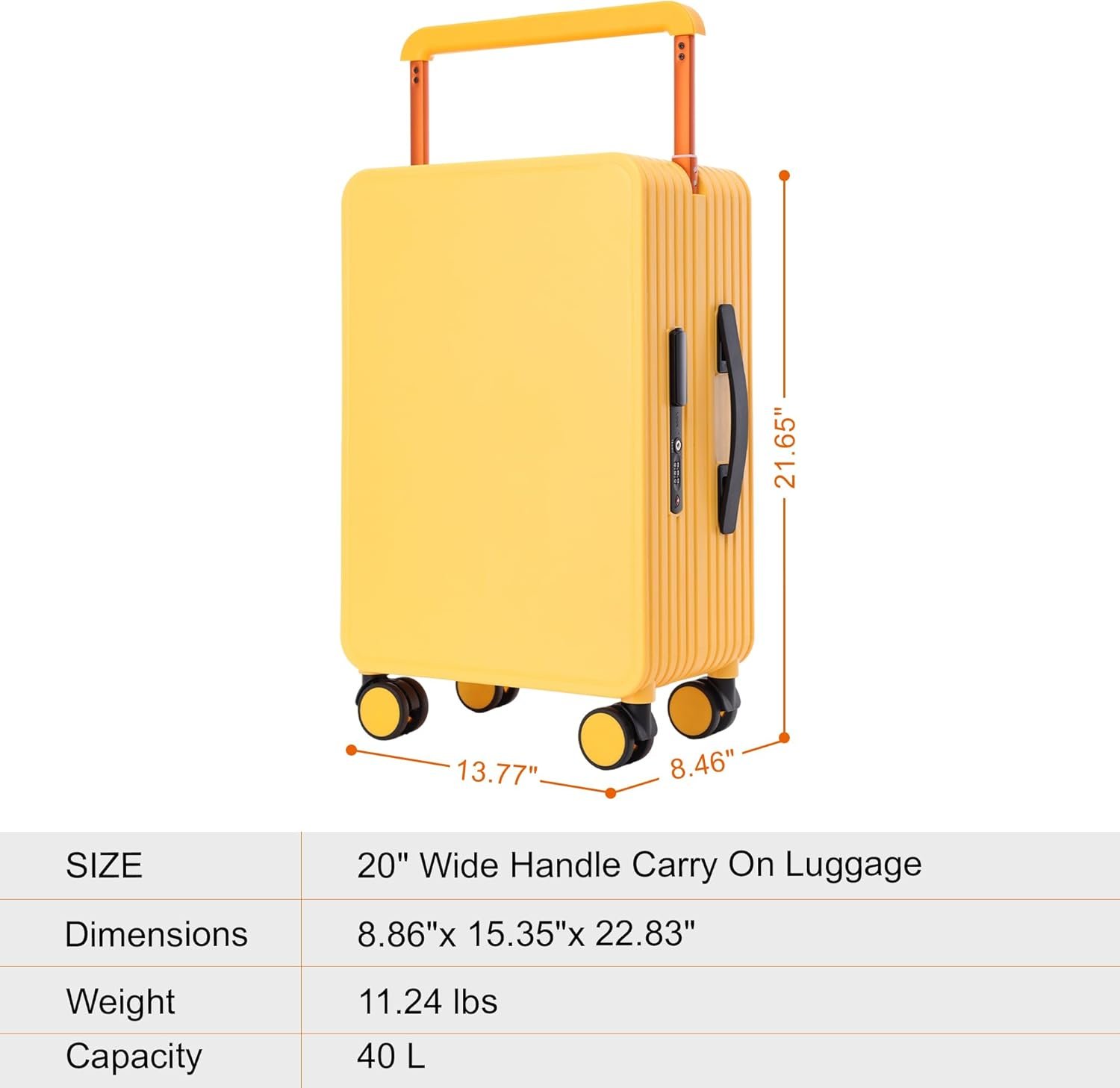 Hard Shell Carry On Luggage 22x14x9 Airline Approved, Wide Handle Hard Case Luggage, Ziperless Away Carry on Luggage, 20 inch, Yellow