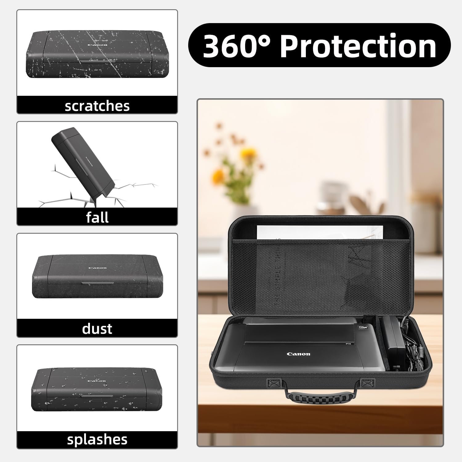 【Durable EVA Shell for Protection】Crafted with a hard EVA exterior, this storage case offers superior shock absorption, dust resistance, and waterproof protection. It safeguards your Canon PIXMA TR150/iP110 wireless portable printer from drops, scratches, bumps, spills, and dust, ensuring it remains in pristine condition wherever you go.
