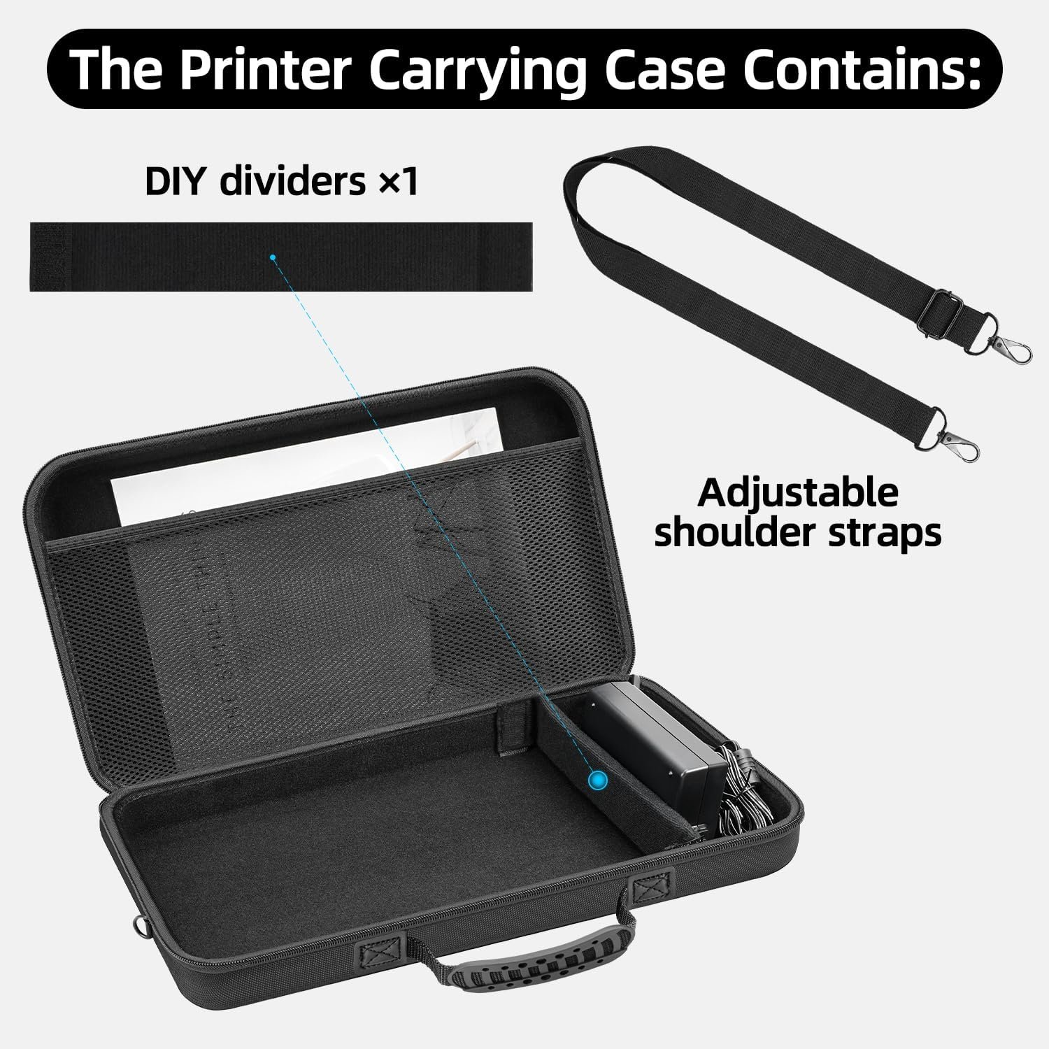 【Customizable Interior with Velcro Pads】Equipped with Velcro divider pads, you can easily customize the interior of the case to fit your specific needs. This ensures your printer is securely held in place and protected from any accidental movements, providing ultimate safety and security.