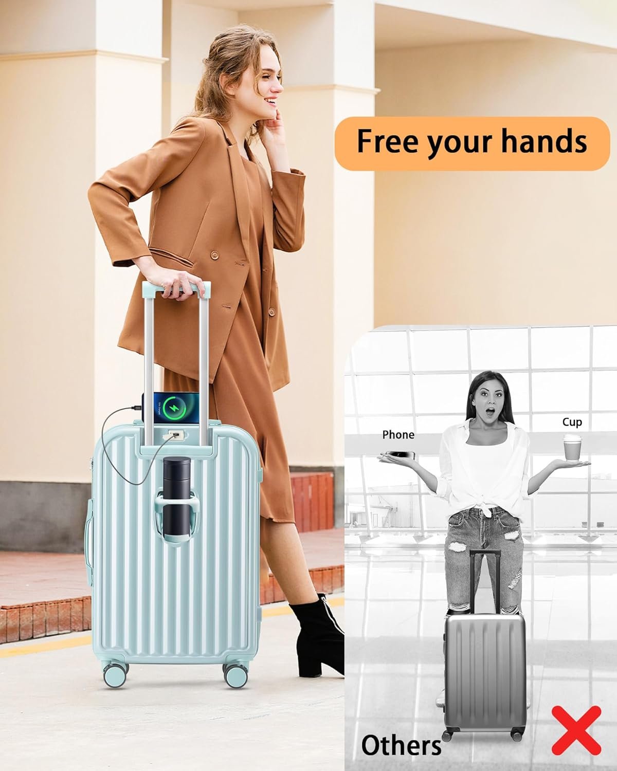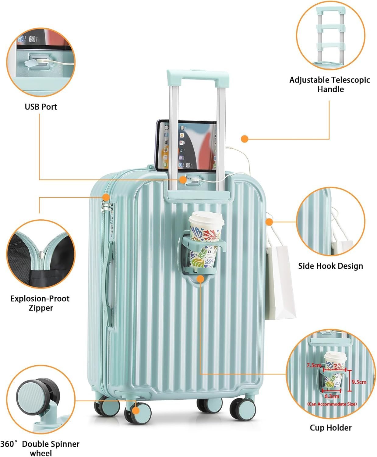 CONVENIENT MULTIFUNCTION HOLDERS:This suitcase features multiple holder designs. On the back, there’s a cup holder for beverages like coffee. Additionally, on the side of the travel suitcase, there is a hook for hanging clothes or other lightweight items