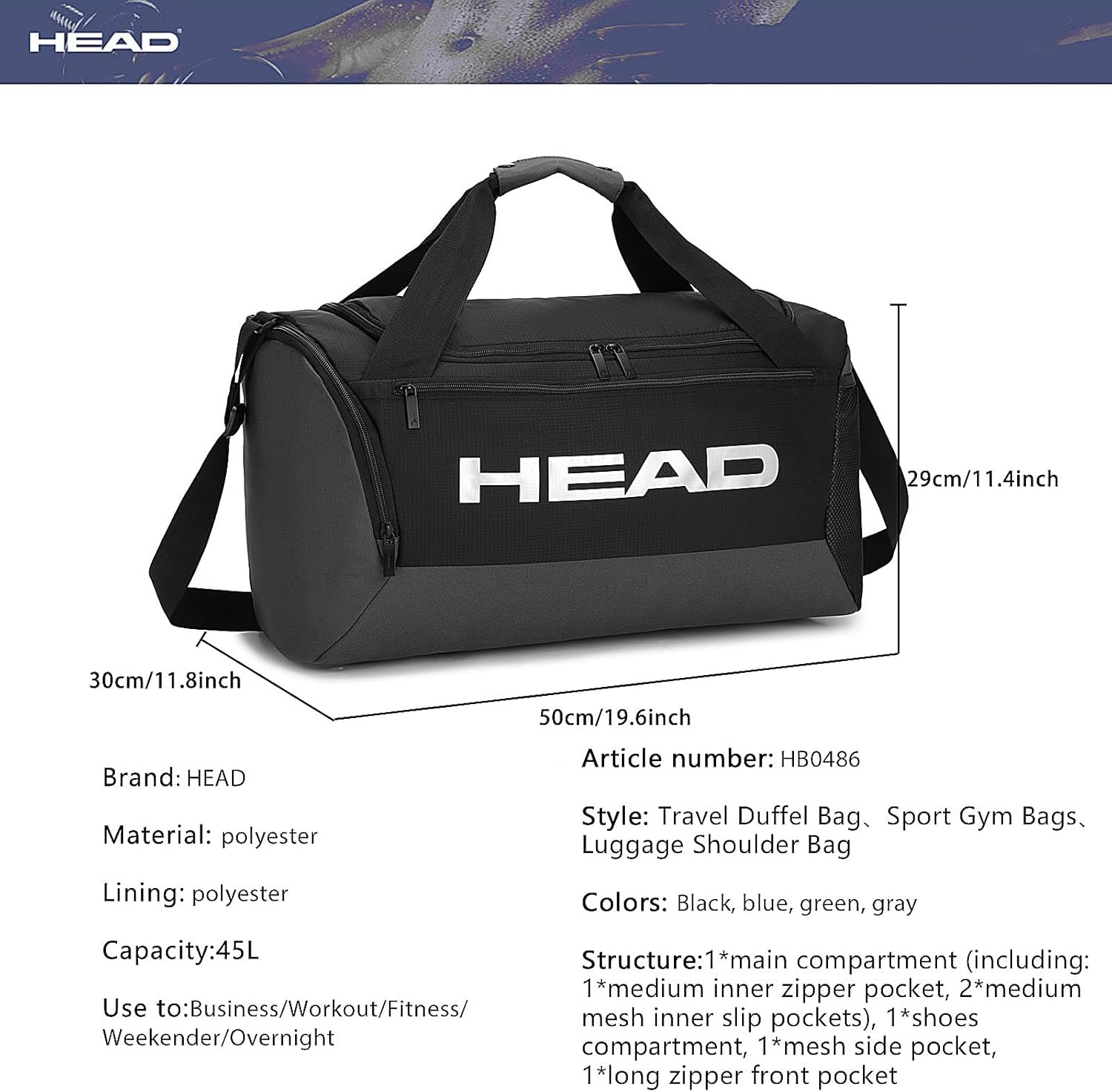 ⭐【Perfect Tennis Duffle Bag】: size: (L*W*H): 50*30*29cm/19.6*11.8*11.4inch; structure: 1*main compartment (including: 1*medium inner zipper pocket, 2*medium mesh inner slip pockets), 1*shoes compartment, 1*mesh side pocket, 1*long zipper front pocket, 1*long shoulder strap, the HEAD tennis duffel bag adopts a U-shaped large opening design, which can show the main compartment space to a large extent, making storage and retrieval more convenient. This sport duffle bag can meet the storage needs of a 3-day trip.