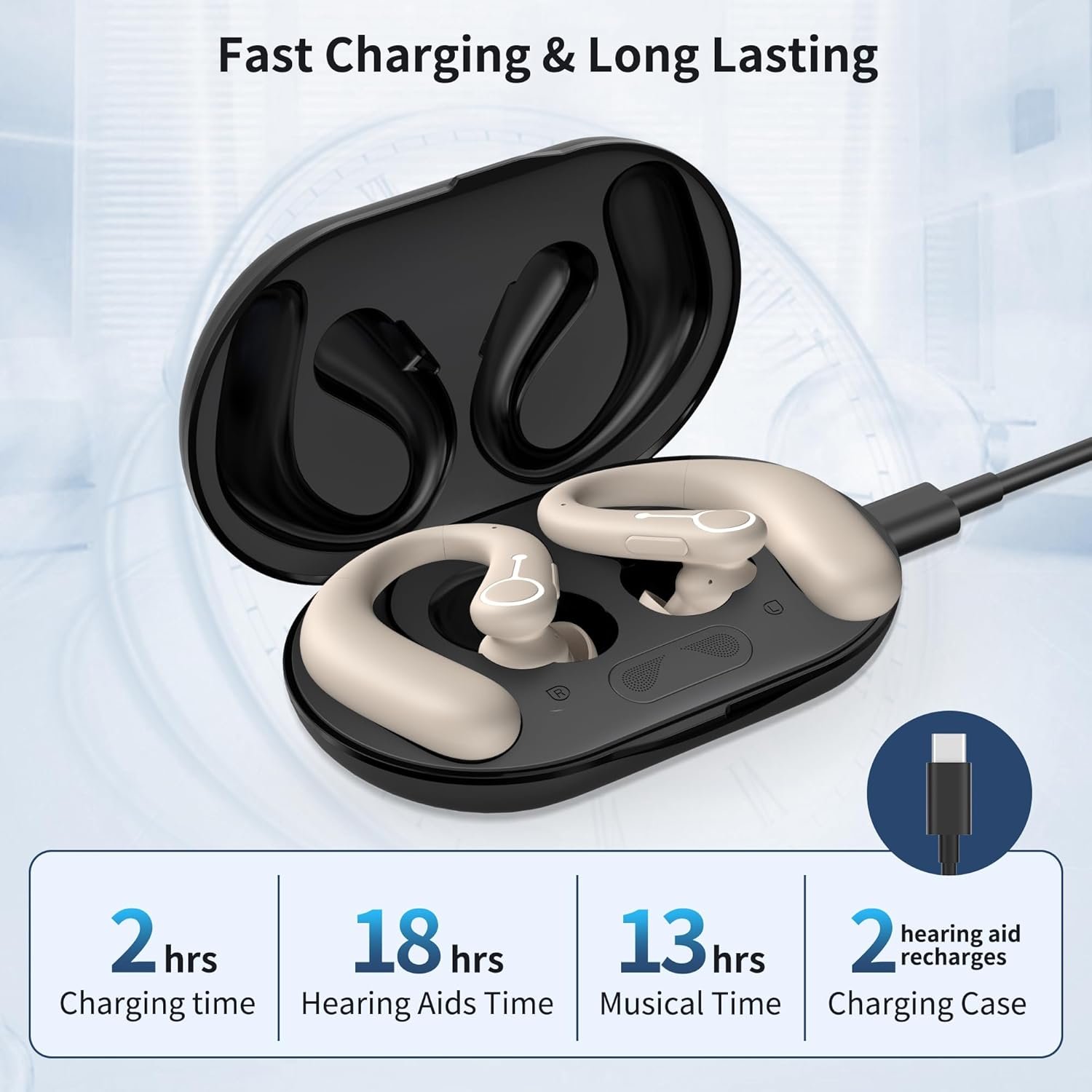 Quick Charge : It takes only 2 hours to fully charge both the charging case and the hearing aids, and the charging case can charge the headphones twice. Fast charging, durable, one charge can help you hear for 18 hours, always help your life