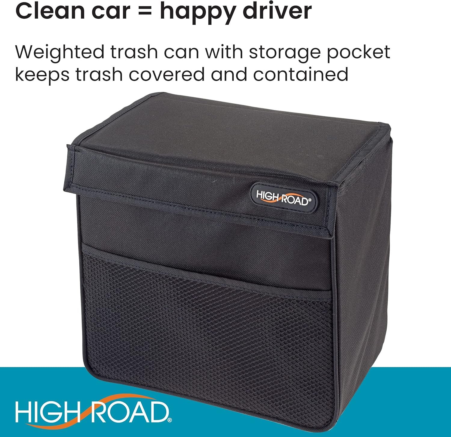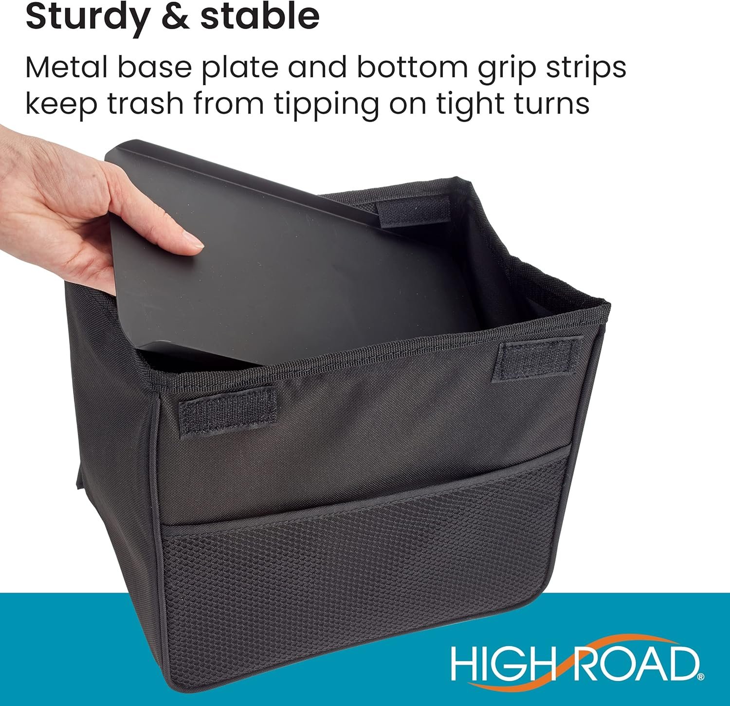 Sturdy Tip-Resistant Car Garbage Can with Bottom Weight and Grip Strips – hard braking and tight turns won’t tip the High Road TrashStand, with its bottom weight and grip strips you can step on the gas without toppling the trash