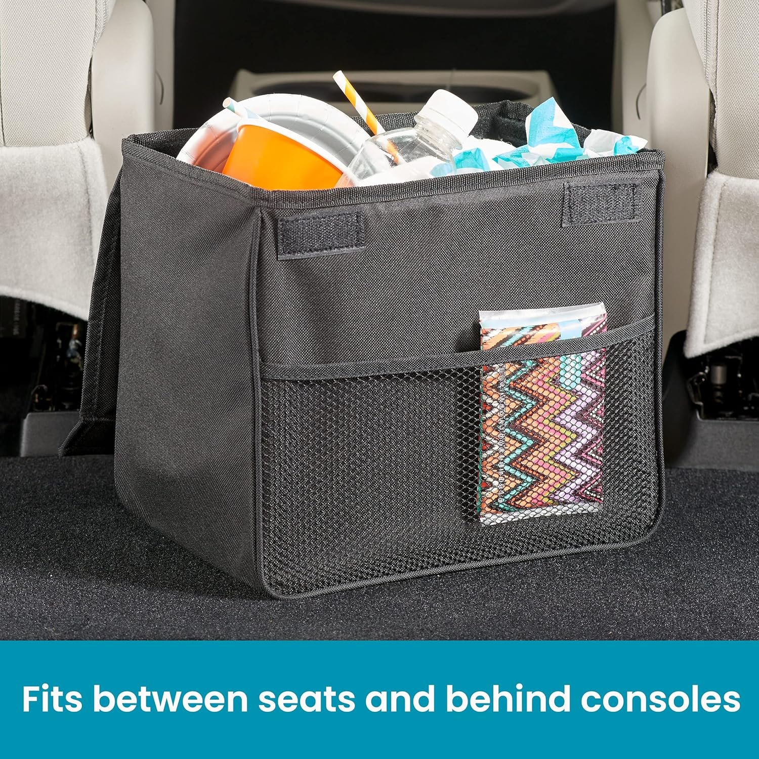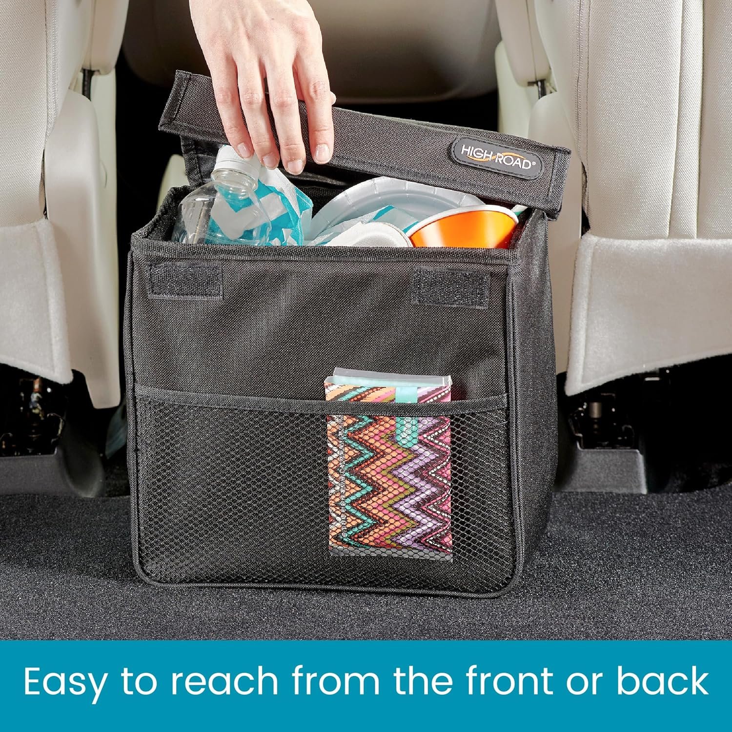 Easy to Open Hinged Cover Keeps Trash and Odor Contained – sturdy lid with hook and loop closure keeps unsightly car trash and odor under cover, a wide front pocket offers car storage for tissues, sanitizer and wipes
