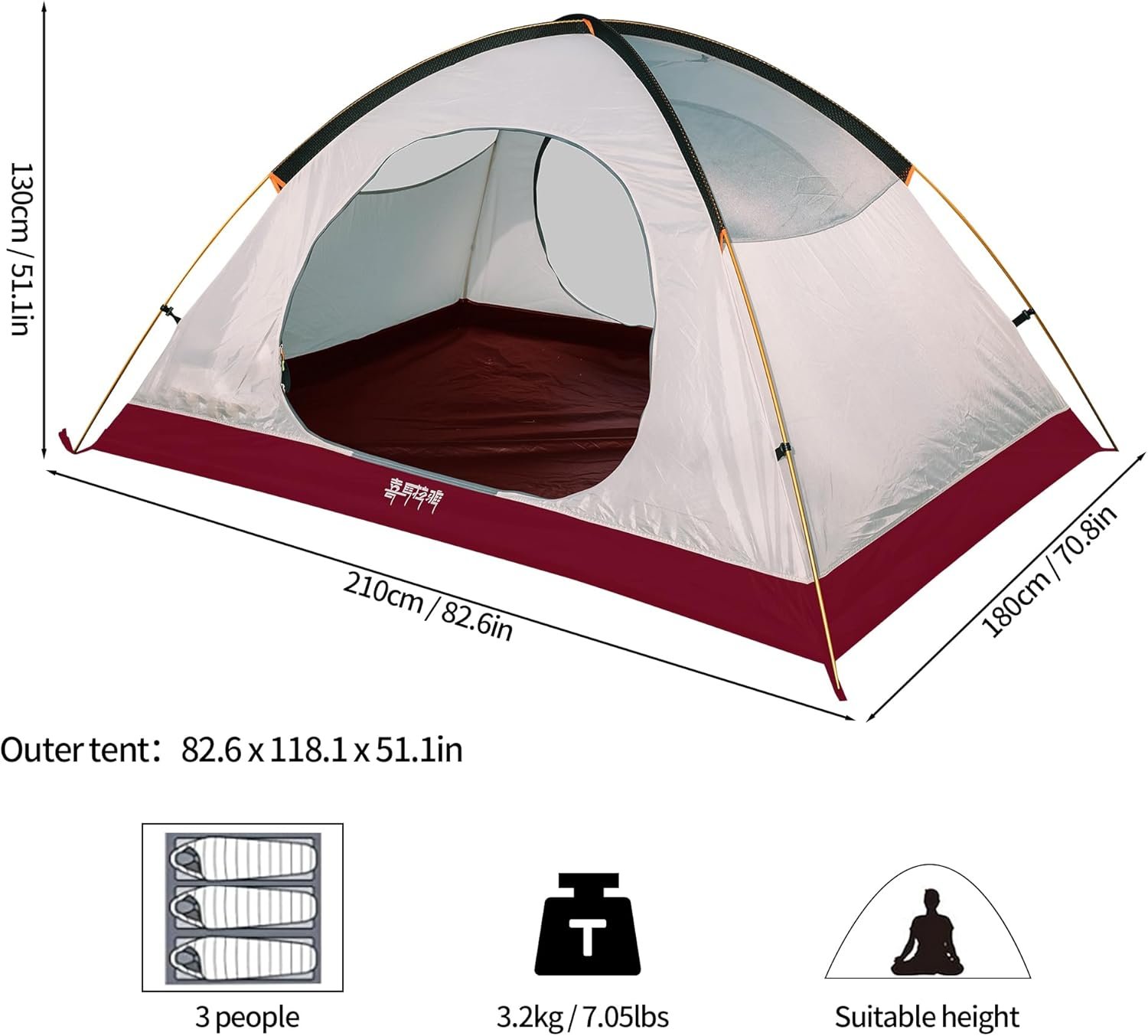 【Tent Size】Outer tent: 210*(50+180+50)*120CM|Inner tent: 210*180*110cm|Weight: 3kg|Accommodate 3 person