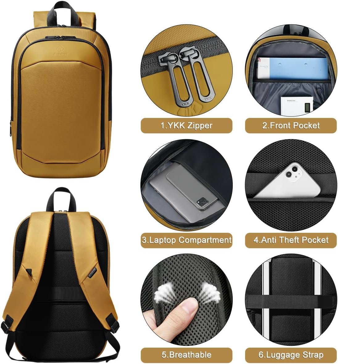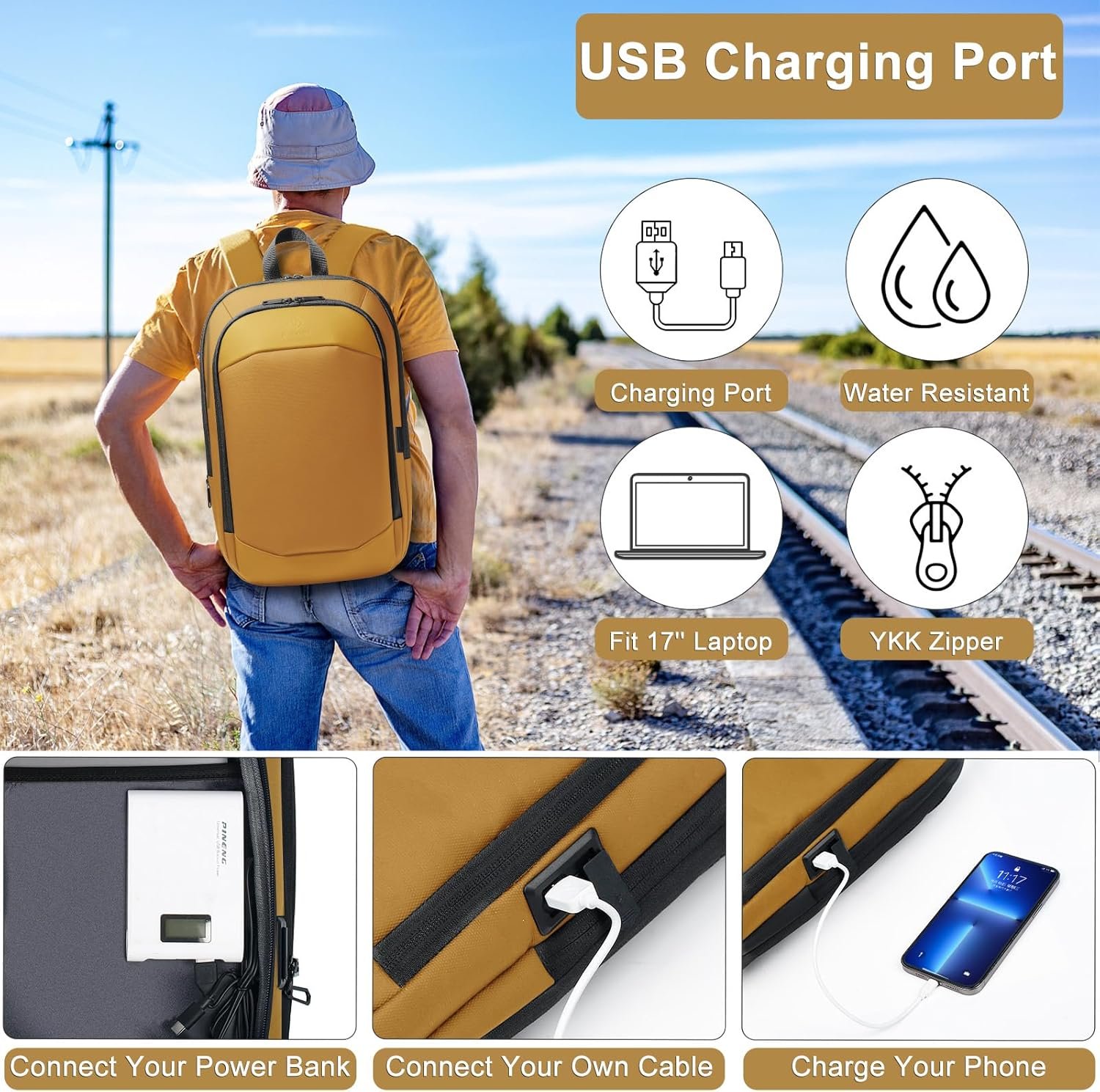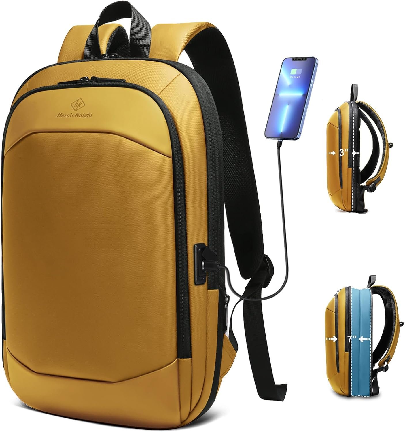 hk Business Backpack for Men 17 Inch,Slim & Expandable Waterproof Travel Laptop Backpack with USB Charger Port (Yellow)