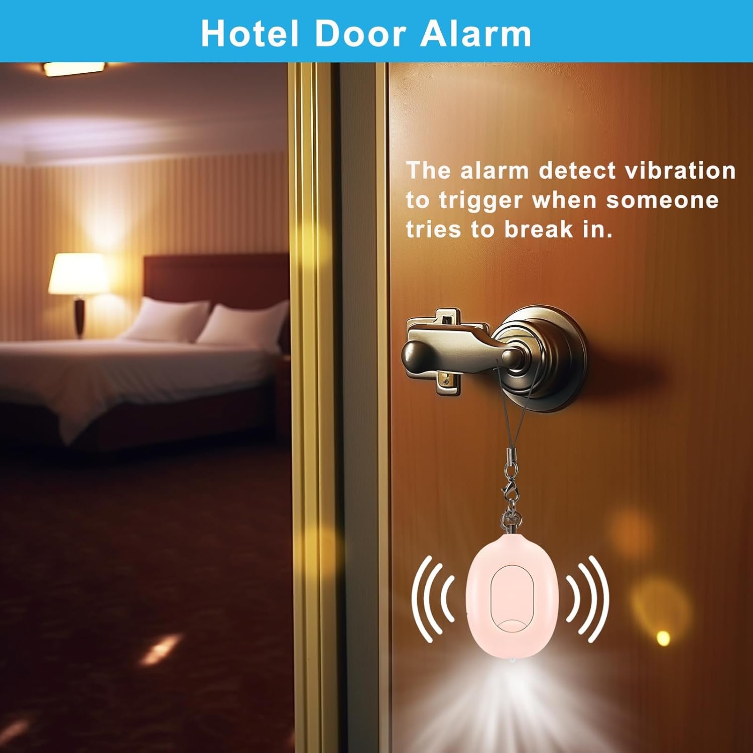 3-In-1 Travel Alarm. It is a hotel door open alarm, luggage anti-theft alarm and self defense personal safety alarm. When the alarm is triggered, it emits an extra loud 130dB sound whistle and blinding flashing light.