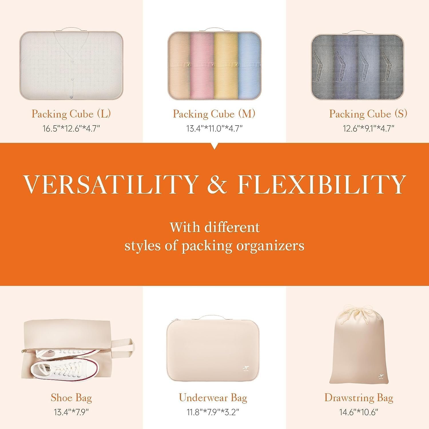 VERSATILE & FLEXIBLE: HOTOR travel cubes for packing feature 6 different sizes and styles of organizers for different items: 3 mesh bags, 1 shoe bag, 1 drawstring pocket, and 1 underwear bag. Moreover, these packing cubes can be used to stay organized at home, while traveling, and are perfect for camping or any outdoor adventure! You can easily fit them into your suitcases, totes, backpacks, duffel bag, etc.