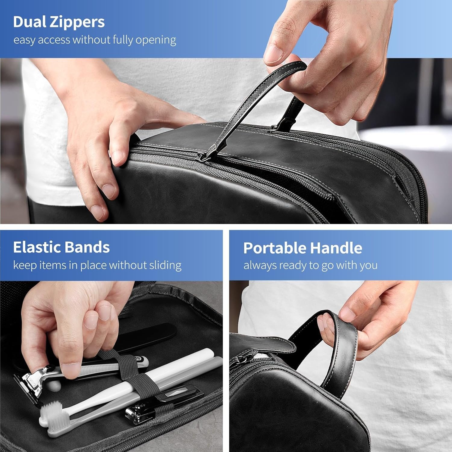 HOTOR Travel Toiletry Bag – Water Resistant Travel Essentials for Women and Men, Compact Leather Toiletries Organizer with Handle, Versatile Cruise Ship Essentials, Black, Medium