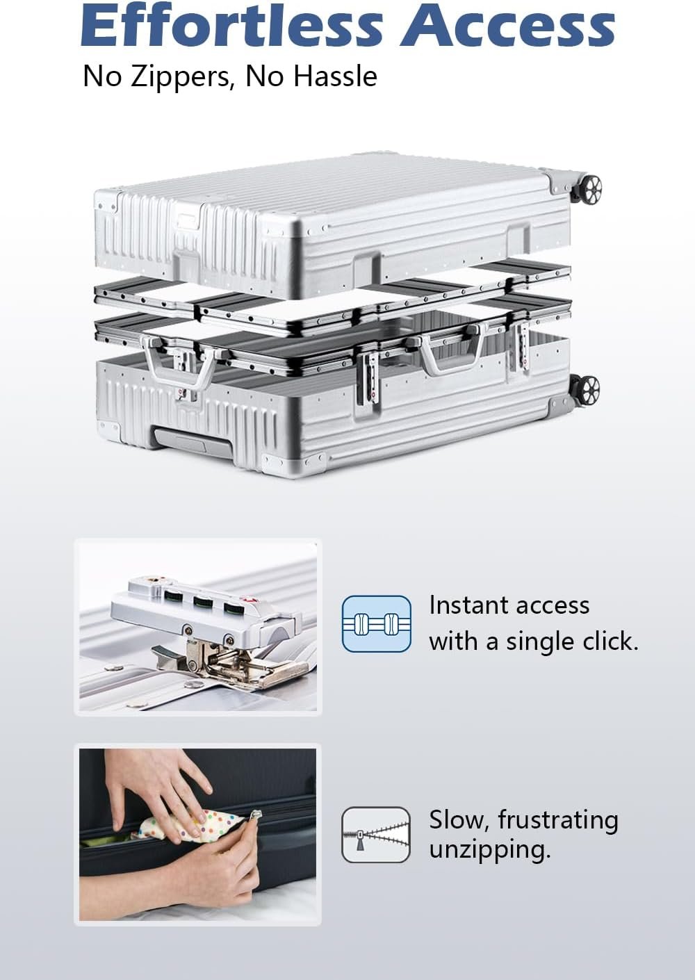 ADVANCED ZIPPERLESS DESIGN: Our zipperless aluminum frame suitcase offers effortless access and enhanced protection. Secure latches replace traditional zippers, eliminating security concerns and stuck zippers. Perfect for travelers seeking peace of mind and convenience during their journeys.