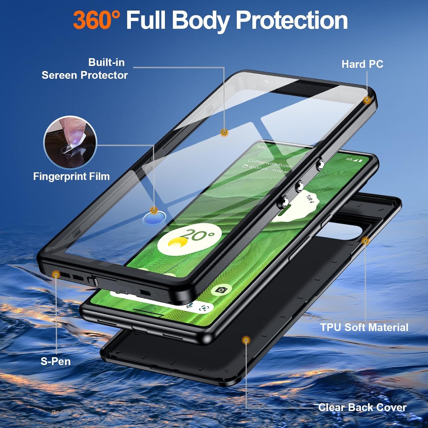 【Sturdy & Compatibility】Hualele Pixel 7 waterproof case passed 12FT Mil-grade shockproof certification. Rugged Waterproof Google Pixe 7 Case, Great for Underwater Photography and Videos.