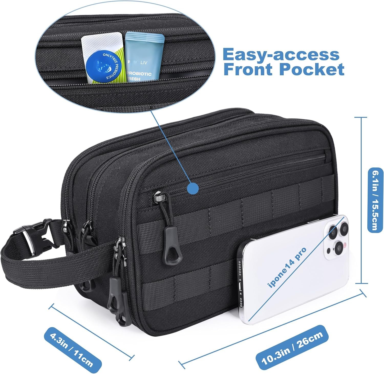Compact Yet Roomy (10.3″x6.1″x4.3″): This travel hygiene kit is big enough to hold all your essentials, like shower gel, face wash, toothbrush, floss, mouth wash, razor etc.. Slim profile fits in carry-ons, duffle bags, tactical backpacks, weekenders, or Harley saddlebags. Upgrade from floppy pouches to a pro-grade system.