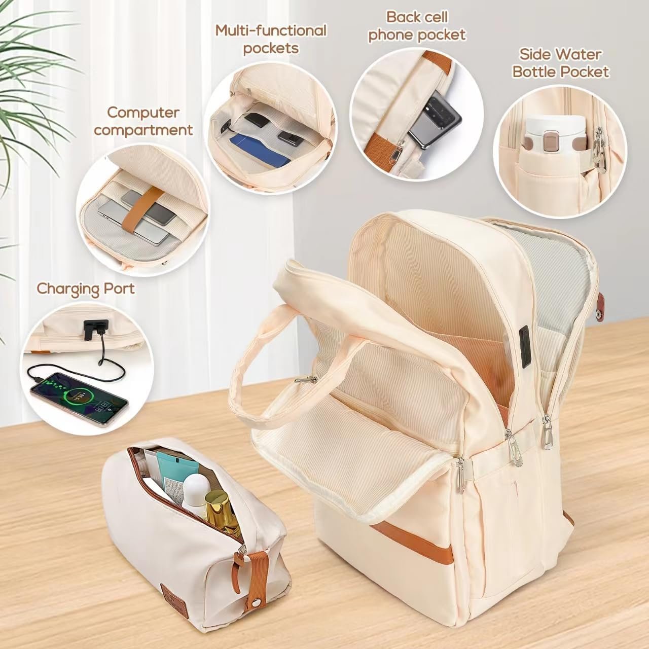 3 PIECE CARRY ON LUGGAGE SET: This beige luggage set includes a 20-inch carry on suitcase, a versatile travel backpack, and a convenient toiletry bag. The travel backpack features a back sleeve that attaches to the retractable handle of the carry on suitcase. Additionally, the travel bag is equipped with a USB interface for connecting to a power bank (not included) and an external data cable for direct charging, offering added convenience for your journey.