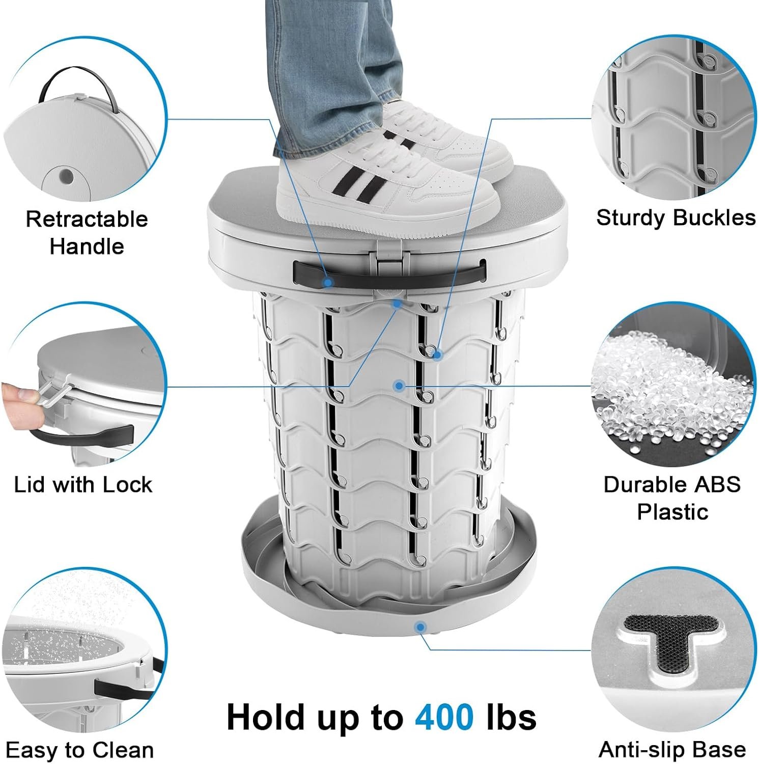 【QUICK & EASY TO USE】 : Pull ends and twist clockwise to start using portable potty instantly! Make sure it is locked before sitting down. After use, just rotate counterclockwise and press it back. Only weighs 3 lbs, our folding toilet is easy to carry and transport with handle and drawstring bag.
