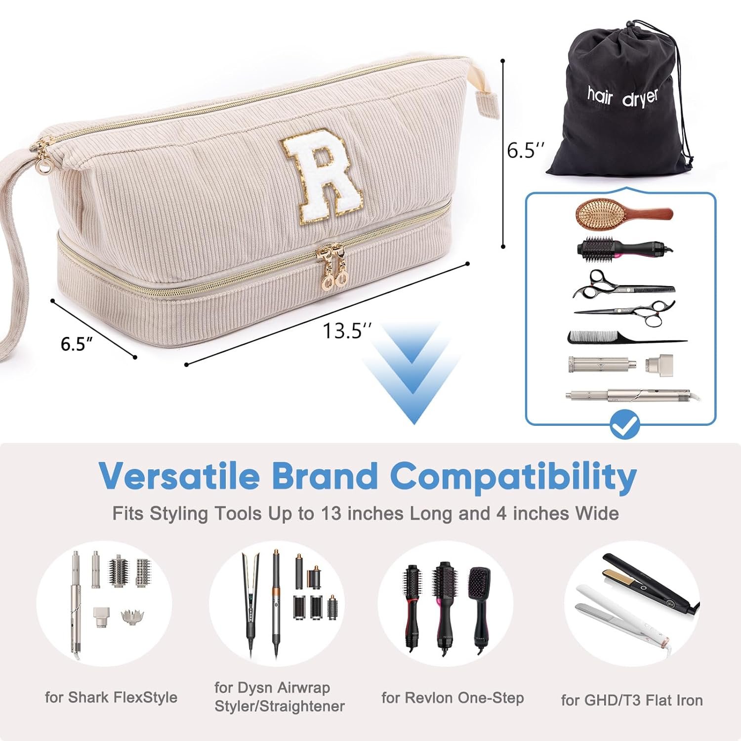 【PERSONALIZED DESIGN】The package includes a double-layer hair travel case and a water-resistant black hair dryer bag with an embroidered logo. The hair dryer carrying case features a gold glitter chenille patch with your chosen initial, adding a customized touch. Additionally, each bag includes an extra pink initial patch as a bonus for DIY.