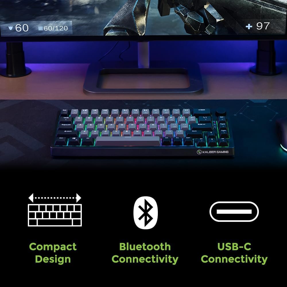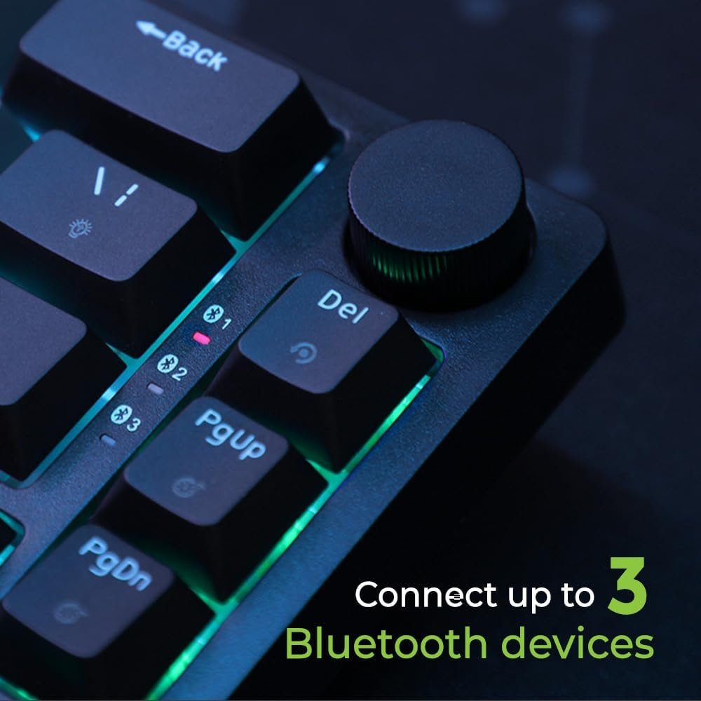 Minimalist Cosmetic design for the smallest footprint, and red linear mechanical switches deliver fast and quiet actuation with the option to connect up to 3 Bluetooth devices