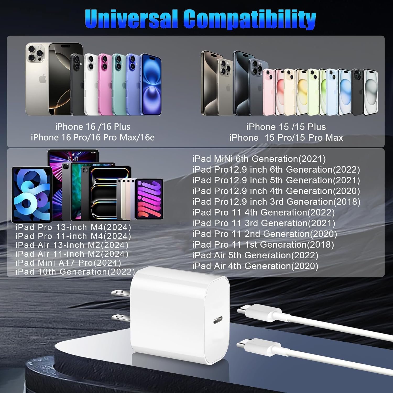 ⚡【Wide adaptability】20W fast charging Apple USB C iPhone 16 Charger for iPhone 16/ iPhone 16 Plus/ iPhone 16 Pro/ iPhone 16 Pro Max/ iPhone 16e/ iPhone 15/ iPhone 15 Plus/ iPhone 15 Pro/ iPhone 15 Pro Max, iPad Pro 13-inch/11-inch M4, iPad Air 13-inch/11-inch M2, iPad Pro 12.9-inch 6th/5th/4th/3th, 11-inch 4th/3th/2th/1th, iPad Air 5th/4th 10.9 inch, iPad Mini 7th 6th 8.3 inch, iPad 10th Gen, Galaxy S25/S24/S23/S22/S21 Ultra/Plus and more cell phone.