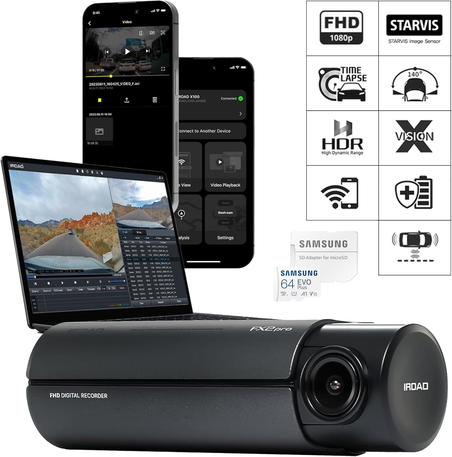 IROAD PRO FX2 Front Dash Cam, FHD 1080p HDR with Sony STARVIS sensor, MADE IN KOREA, Time Lapse, GPS, 140º Wide Angle, ADAS, Wi-Fi, X-Vision, Battery Discharge Prevention, Mobile APP, 64GB SD INCLUDED