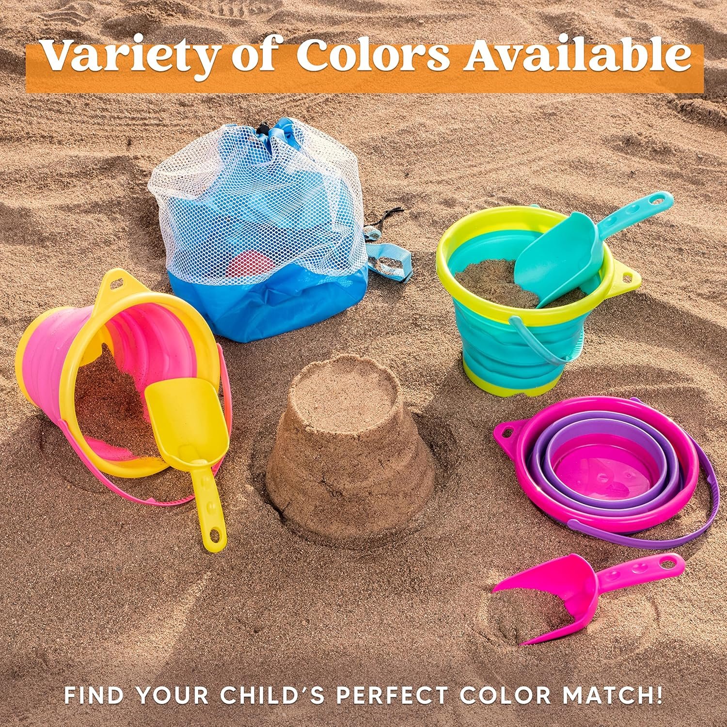 SUPER VALUE PACK: Our kid’s summer toys Set includes 3 collapsible round beach buckets with handles, 3 sand shovels, and 1 mesh backpack, each bucket is about 8.1” x 6.3” 0.66 Gallons Capacity when unfolded. Complete outdoor and indoor sand play sets, all for an unbelievable price! This bundle of sand toys will be adored by your child!