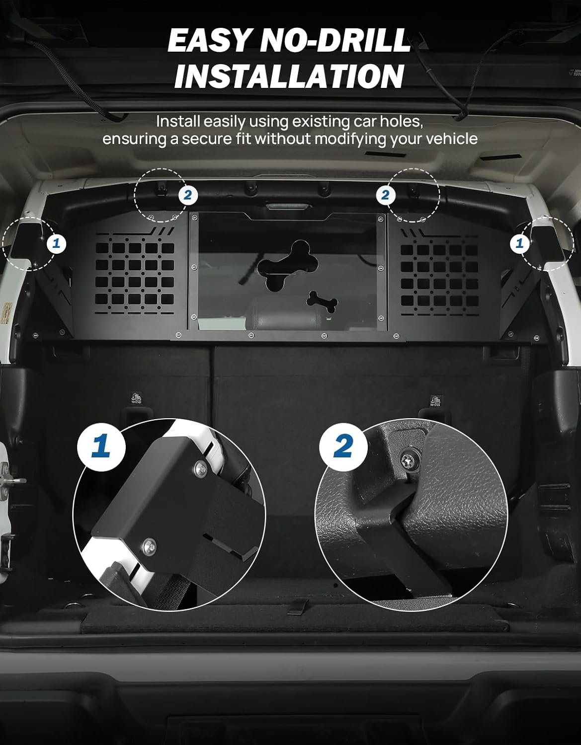No Drill Dog Car Barrier: Uses original car holes for fast, secure installation without modifications. Easy to install and remove, making it an ideal car divider for dogs