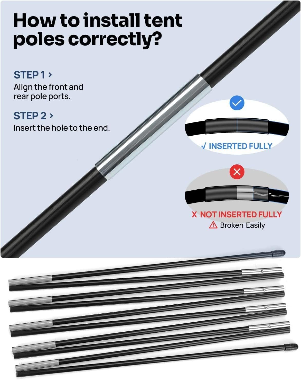 Installation Tips: Pay attention when you install Tent Poles, check the front and rear poles are tightly connected and seamless, otherwise the poles will be broken easily. The ends of the main poles feature color-matching markings. Makes it easy to quickly find the correct installation. (If during installation tent pole breaks due to improper operation, we will provide one-time free opportunity to replace the pole)